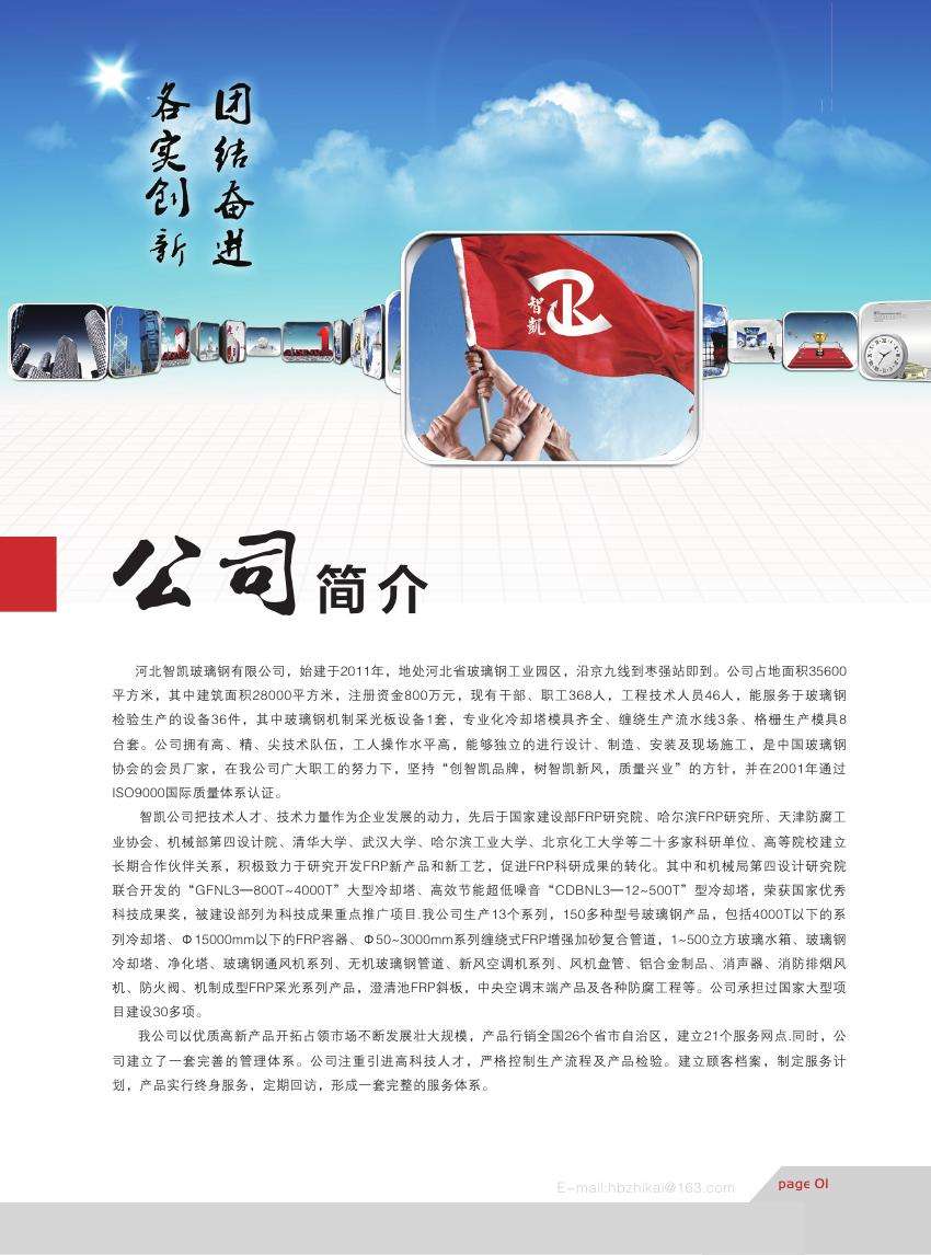 河北智凱玻璃鋼有限公司,前身為河北瑞隆玻璃鋼有限公司,地處河北省玻璃鋼工業園區,沿京九線到棗強站即到。公司占地面積35600平方米,其中建筑面積28000平方米,注冊資金2800萬元,現有干部、職工368人,工程技術人員46人,能服務于玻璃鋼檢驗生產的設備36件,其中玻璃鋼機制采光板設備1套,專業化冷卻塔模具齊全、纏繞生產流水線3條、格柵生產模具8臺套。公司擁有高、精、尖技術隊伍,工人操作水平高,能夠獨立的進行設計、制造、安裝及現場施工,是中國玻璃鋼協會的會員廠家,在我公司廣大職工的努力下,堅持“創智凱品牌,樹智凱新風,質量興業”的方針,并在2012年通過ISO9000國際質量體系認證。   智凱公司把技術人才、技術力量作為企業發展的動力,先后于國家建設部FRP研究院、哈爾濱FRP研究所、天津防腐工業協會、機械部第四設計院、清華大學、武漢大學、哈爾濱工業大學、北京化工大學等二十多家科研單位、高等院校建立長期合作伙伴關系,積力于研究開發FRP新產品和新工藝,促進FRP科研成果的轉化。其中和機械局第四設計研究院聯合開發的“GFNL3—800T~4000T”大型冷卻塔、高效節能超低噪音“CDBNL3—12~500T”型冷卻塔,榮獲國家優秀科技成果獎,被建設部列為科技成果重點推廣項目.我公司生產13個系列,150多種型號玻璃鋼產品,包括4000T以下的系列冷卻塔、Φ15000mm以下的FRP容器、Φ50~3000mm系列纏繞式FRP增強加砂復合管道,1~500立方玻璃水箱、玻璃鋼冷卻塔、凈化塔、玻璃鋼通風機系列、無機玻璃鋼管道、新風空調機系列、風機盤管、鋁合金制品、消聲器、消防排煙風機、防火閥、機制成型FRP采光系列產品,澄清池FRP斜板,中央空調末端產品及各種防腐工程等。公司承擔過國家大型項目建設30多項。 我公司以優質高新產品開拓占領市場不斷發展壯大規模,產品行銷全國26個省市自治區,建立21個服務網點.同時,公司建立了一套完善的管理體系。公司注重引進高科技人才,嚴格控制生產流程及產品檢驗。建立顧客檔案,制定服務計劃,產品實行終身服務,定期回訪,形成一套完整的服務體系。