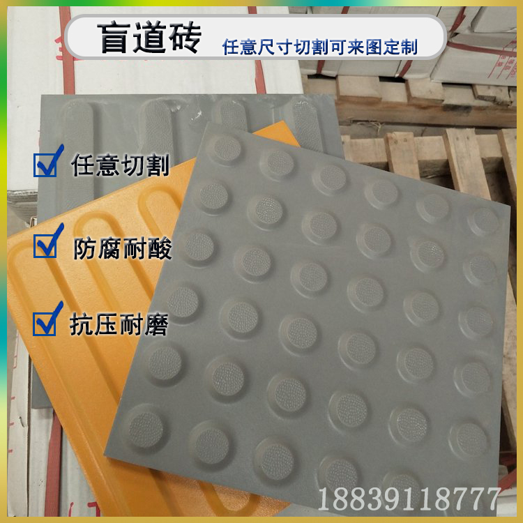 盲道磚是按照國際殘聯的相關標準制造,設計優良,具有靈敏的觸覺感,強腐蝕,耐損耗性和長壽命等特征。這種高強塑橡盲道磚的表面既美麗又光滑,適用于室內或室外裝修。它凹凸的模型不僅可以使盲道更加安全,同時還美化環境作用。