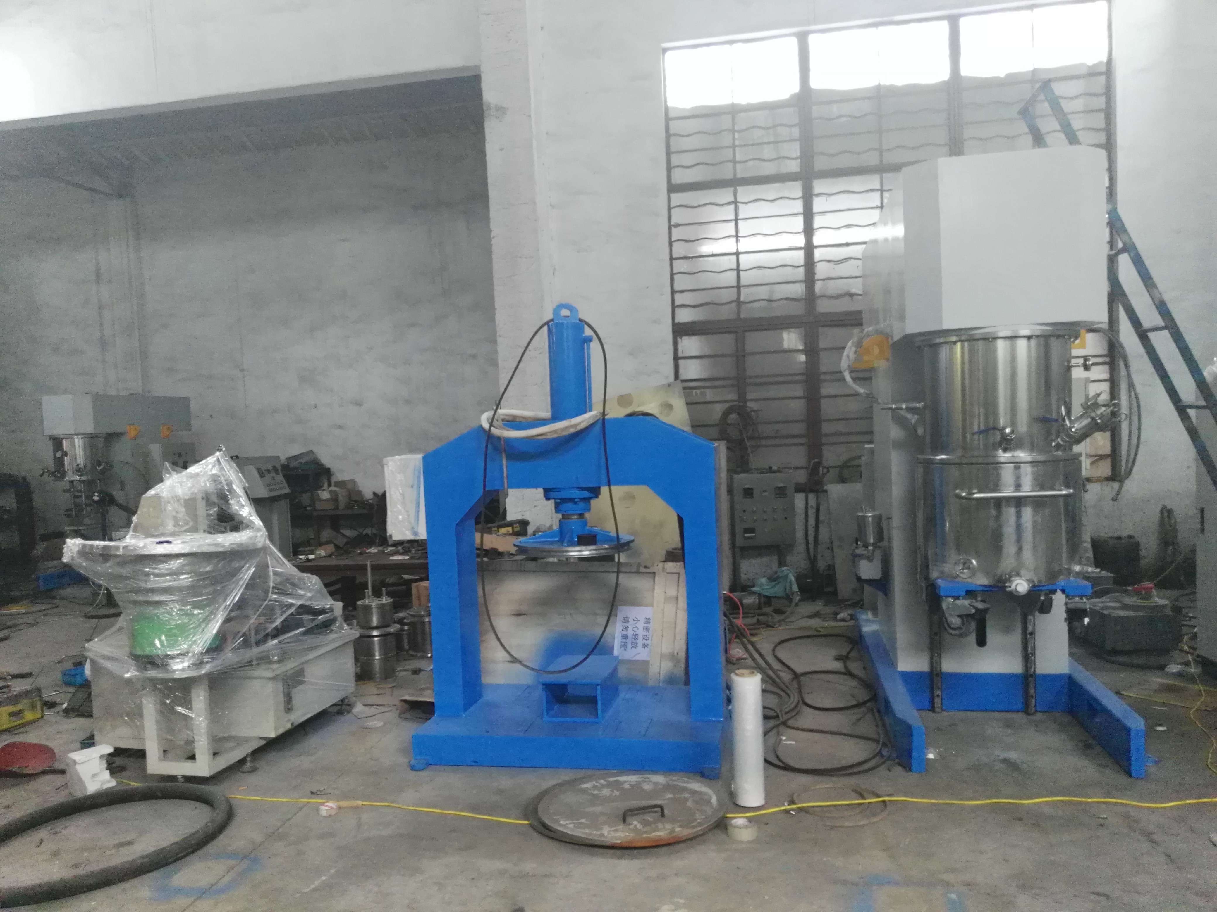 行星架轉動時,帶動箱內的三根攪拌、分散軸圍繞料桶軸線公轉的同時高速自轉,從而使物料受到強烈的剪切、捏合作用,達到充分分散和混合的目的;在行星架上有一刮壁刀隨行星架轉動,緊貼桶壁不斷的刮試,使桶壁無滯留料,提高混合效果。攪拌時間的長短根據物料的屬性的不同由用戶掌握,可通過控制面板調節。封蓋及行星攪拌器由雙柱液壓升降,操作平穩、快捷、輕便。
