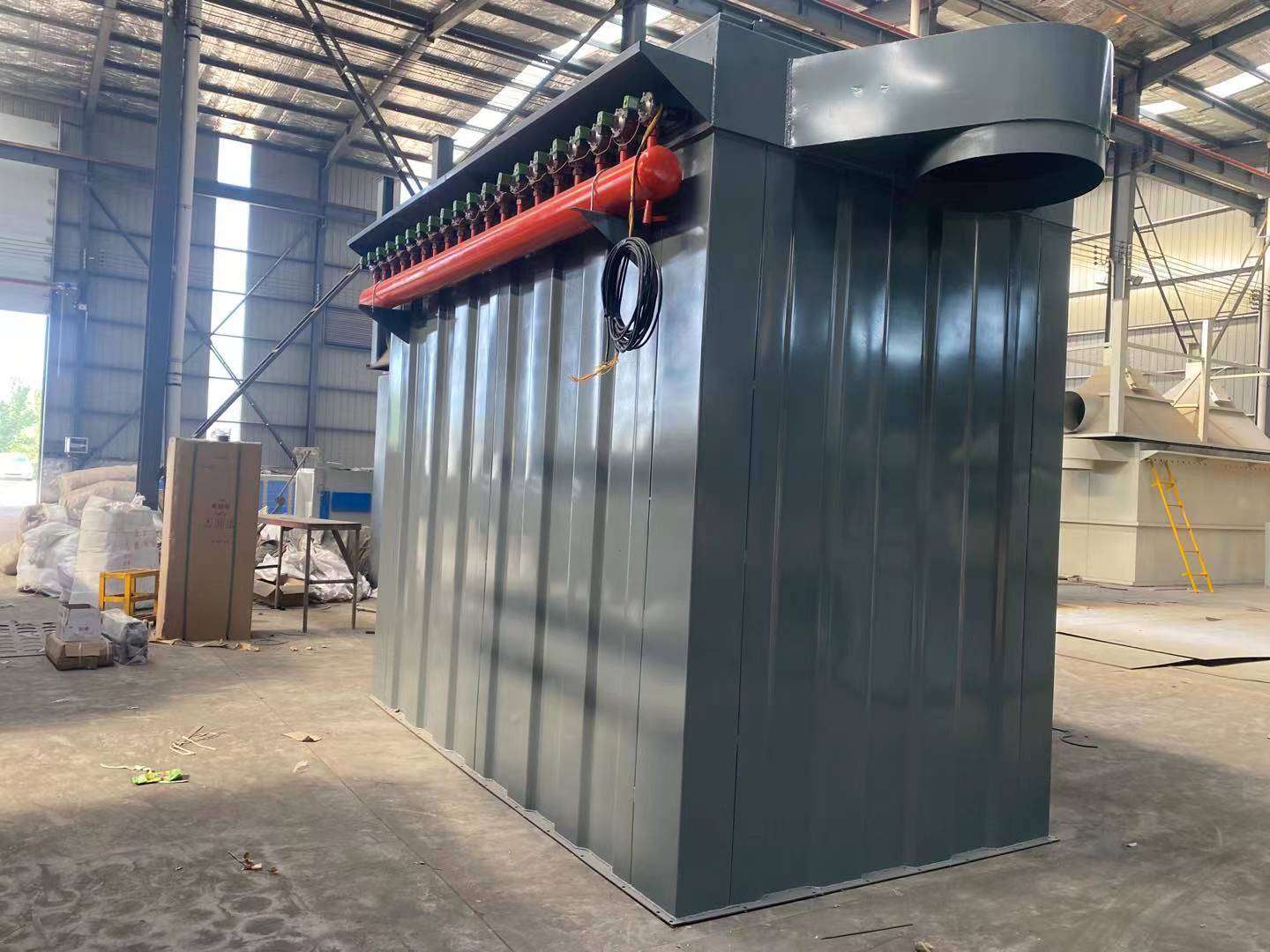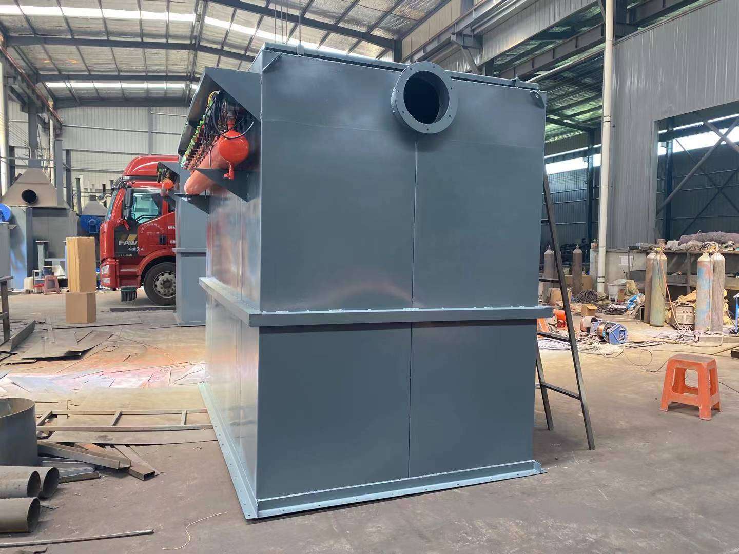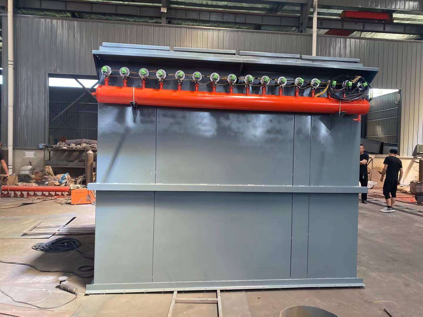 脈沖布袋除塵器的作用原理 : 脈沖布袋除塵器由灰斗、上箱體、中箱體、下箱體等部分組成,上、中、下箱體為分室結構。工作時,含塵氣體由進風道進入灰斗,粗塵粒直接落入灰斗底部,細塵粒隨氣流轉折向上進入中、下箱體,粉塵積附在濾袋外表面,過濾后的氣體進入上箱體至凈氣集合管-排風道,經排風機排至大氣。 清灰過程是先切斷該室的凈氣出口風道,使該室的布袋處于無氣流通過的狀態(分室停風清灰)。然后開啟脈沖閥用壓縮空氣進行脈沖噴吹清灰,切斷閥關閉時間足以保證在噴吹后從濾袋上剝離的粉塵沉降至灰斗,避免了粉塵在脫離濾袋表面后又隨氣流附集到相鄰濾袋表面的現象,使濾袋清灰徹底,并由可編程序控制儀對排氣閥、脈沖閥及卸灰閥等進行全自動控制 特點:1、脈沖布袋除塵器采用分室停風脈沖噴吹清灰技術,克服了常規脈沖除塵器和分室反吹除塵器的缺點,清灰能力強,除塵效率高,排放濃度低,漏風率小,能耗少,鋼耗少,占地面積少,運行穩定可靠,經濟效益好。適用于冶金、建材、水泥、機械、化工、電力、輕工行業的含塵氣體的凈化與物料的回收。 2、由于采用分室停風脈沖噴吹清灰,噴吹一次就可達到徹底清灰的目的,所以清灰周期延長,降低了清灰能耗,壓氣耗量可大為降低。同時,濾袋與脈沖閥的疲勞程度也相應減低,從而成倍地提高濾袋與閥片的壽命。 3、檢修換袋可在不停系統風機,系統正常運行條件下分室進行。濾袋袋口采用彈性漲圈,密封性能好,牢固可靠。濾袋龍骨采用多角形,減少了袋與龍骨的磨擦,延長了袋的壽命,又便于卸袋。4、采用上部抽袋方式,換袋時抽出骨架后,臟袋投入箱體下部灰斗,由人孔處取出,改善了換袋操作條件。 5、箱體采用氣密性設計,密封性好,檢查門用優良的密封材料,制作過程中以煤油檢漏,漏風率很低。 6、進、出口風道布置緊湊,氣流阻力小