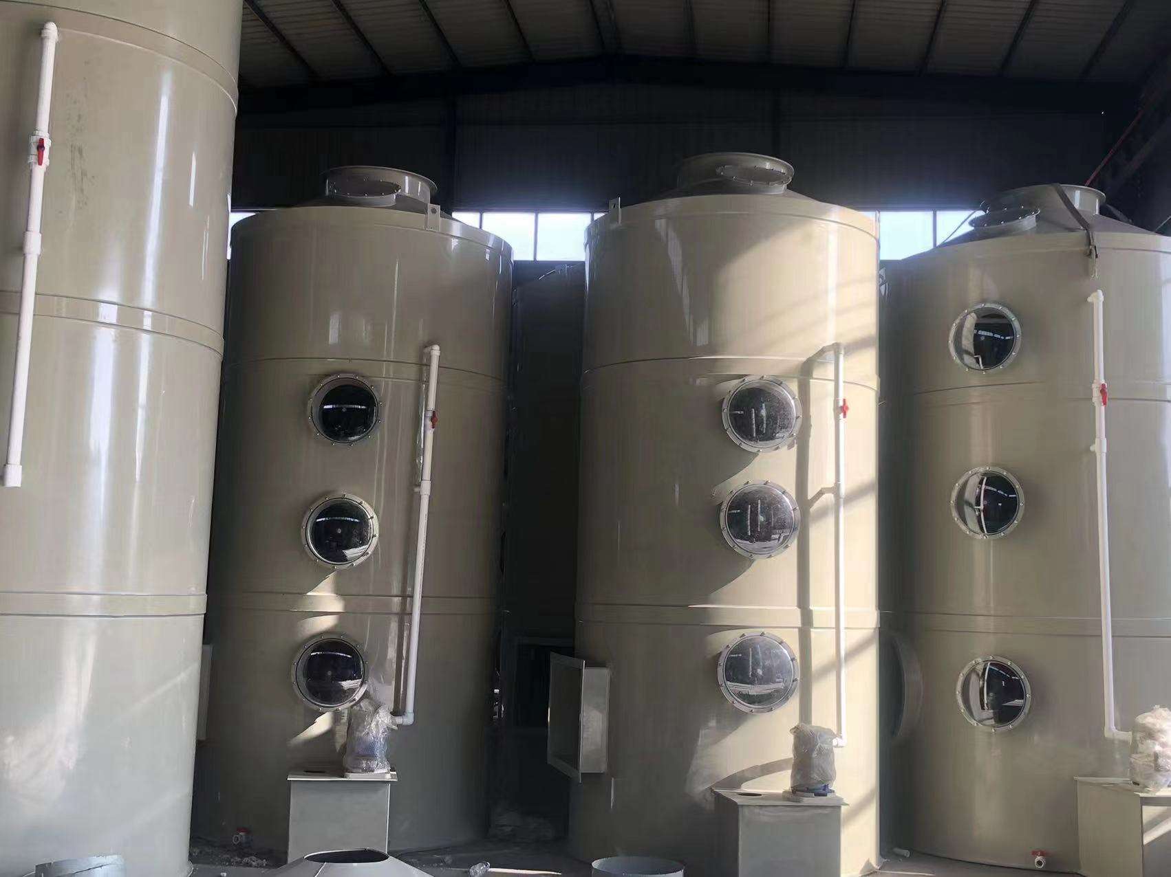 噴淋塔的作用原理 含塵氣體和黑煙尾氣通過煙道進入噴淋塔的底錐,粉塵被水浴洗滌。處理后的黑煙、粉塵等污染物通過水浴后,部分塵粒隨氣體運動,與沖擊水霧和循環噴淋水相結合,在主體內進一步充分混合。此時,含塵氣體中的塵粒被水捕集,灰水被離心或濾出,由于重力作用通過塔壁流入循環池,凈化后的氣體排出。廢水循環池中的沉淀物應定期清理并運走。 一般認為所有易溶于水的氣體都可以用噴淋塔處理,但不一定準確。對于易溶于水但低蒸汽壓易揮發的,噴淋塔處理效率低于20% 原理是利用排氣扇的吸力將連續的廢氣輸送到噴淋塔,使廢氣輸送到系統的噴淋塔。在噴淋塔中,氣體經過中和液的噴淋洗滌過程,廢氣中所含的廢氣與中和液體水霧充分接觸、混合并充分中和。形成氣體和液體的良好交集。
