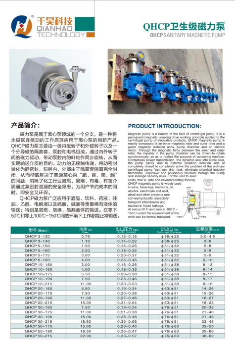 磁力離心泵磁力離心泵是將永磁聯(lián)軸器的工作原理用于離心泵的高科技產品,設計合理,工藝先進,具有全密封,無泄漏,耐腐蝕等特點磁力離心泵可廣泛用于化工、制酸、制堿、冶煉、稀土、農藥、染料、醫(yī)藥、造紙、電鍍、酸洗、無線電、化成箔、石油、食品、電影照相洗印、科研機構、國防工業(yè)等單位抽送酸、堿液、油類稀有貴重液、毒液、揮發(fā)性液體,特別是易漏、易燃、易爆液體的輸送與增壓。QHCP磁力泵是理想的綠色化工裝備,它將對化工、石油化工、制藥和印染等生產企業(yè)的增產節(jié)支、消除污染、保護環(huán)境、安全生產和勞動保護等方面帶來較高的經(jīng)濟效益和社會效益。