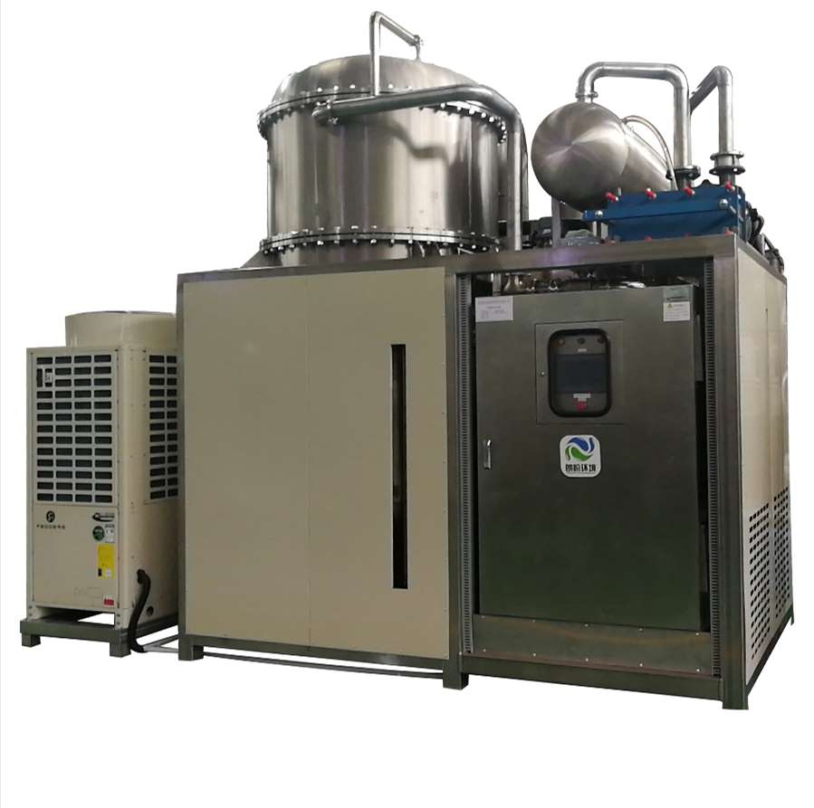 低溫熱泵蒸發器采用熱泵壓縮的原理,在兩端輸出熱媒和冷媒同時對物料進行蒸發和對蒸汽進行冷凝,與此同時高真空度保證物料能在極低的溫度下進行蒸發,這就解釋了為什么熱泵蒸發技術在小型蒸發應用上高效節能及環保。