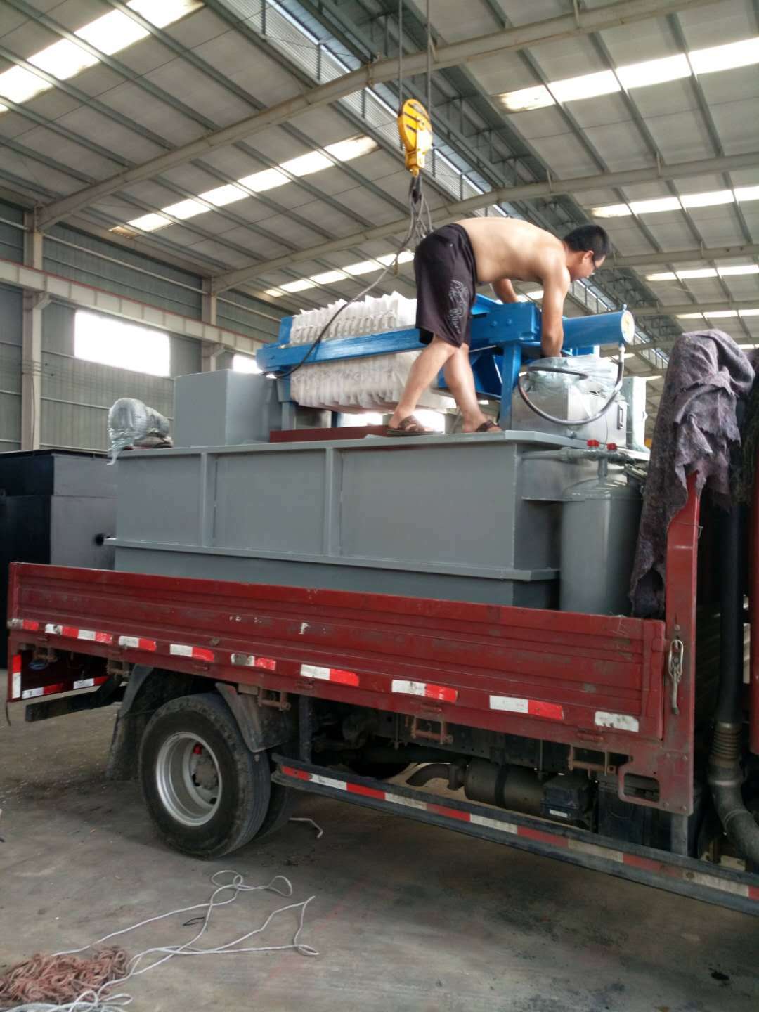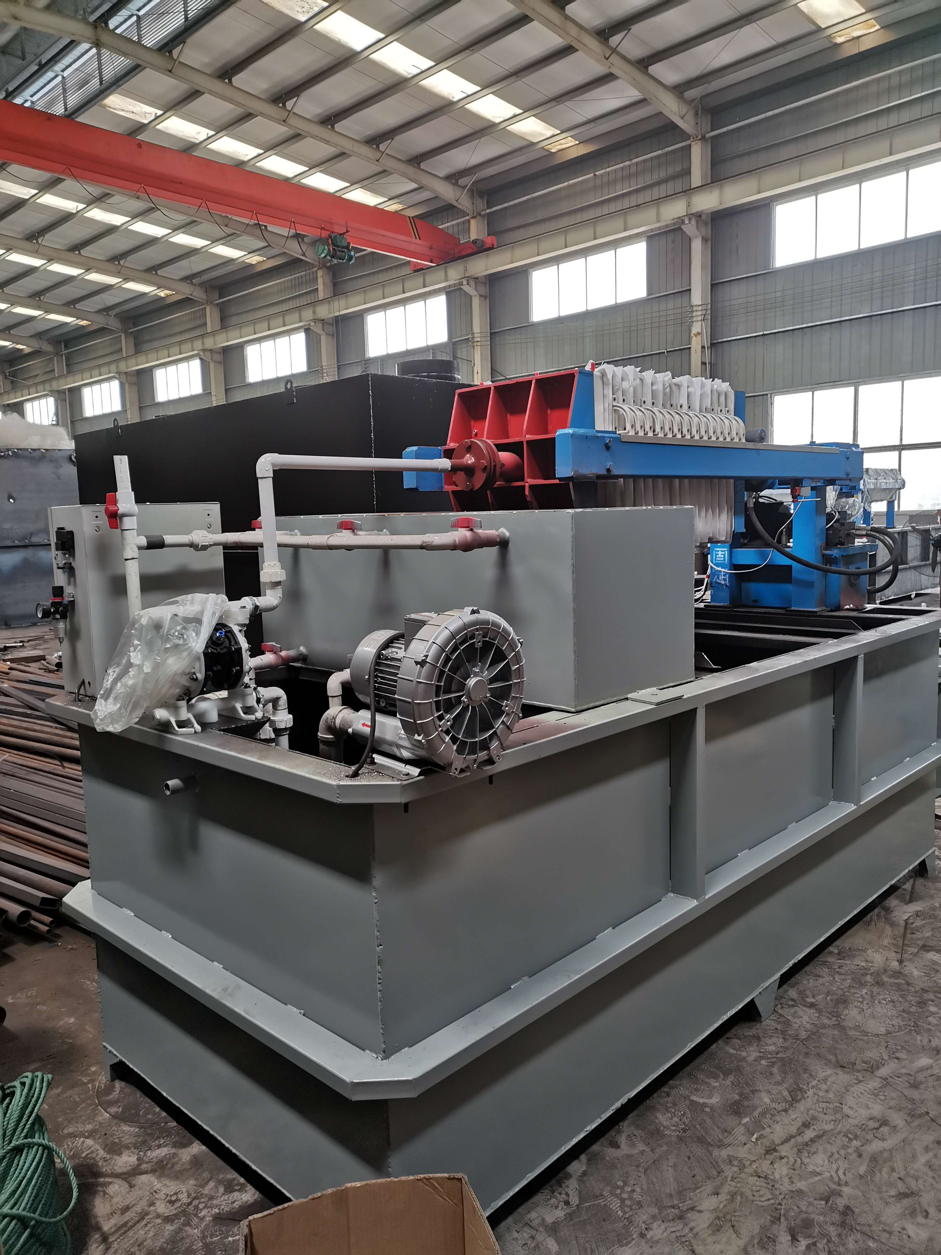 在接觸區內,微氣泡與廢水絮凝體互相粘合,一起進入分離區,在一體機的作用下,絮體與氣泡一起上升至液面,形成浮渣,浮渣和污水由啟動隔膜泵板框壓濾機內。固液分離,清水進入清水池,由污水泵提升進入多介質過濾器,有效的過濾.吸附污水中的有害污水。污泥由板框壓濾機壓干成泥餅外運