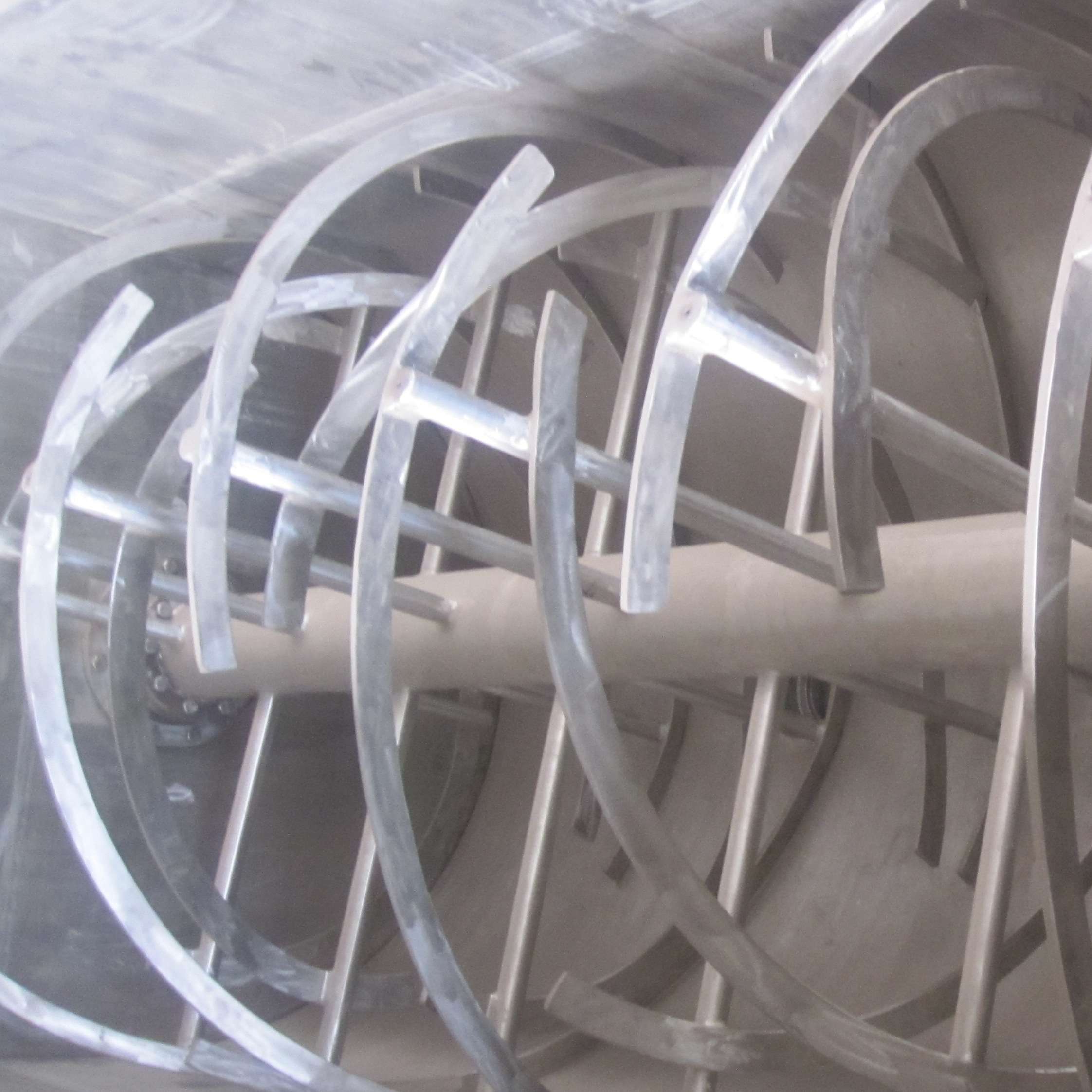 螺旋部分:筒體內兩只非對稱排列的懸臂螺旋作自、公轉行星運動時,在較大范圍內翻動物料,使物料快速達到均勻混合。