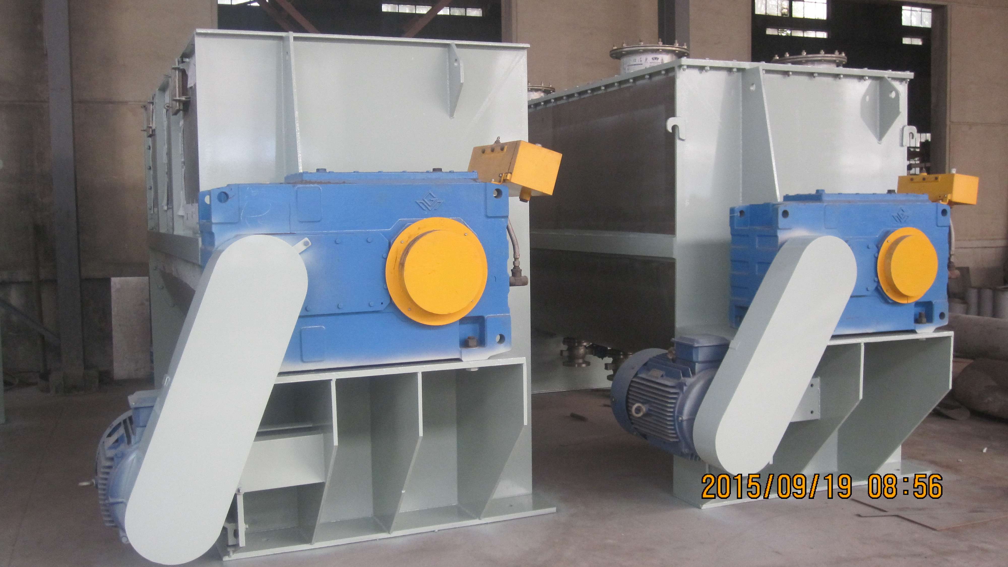 混合機底部出料方式:粉體物料采用氣動大開門結構形式,具有卸料快、無殘余等優點;高細度物料或半流體物料采用采用手動蝶閥或者氣動蝶閥,手動蝶閥經濟適用,氣動蝶閥對半流體的密封性好,但造價比手動蝶閥高。在需要加熱或冷卻的場合,可配置夾套。加熱方式有電加熱和導熱油加熱兩種方式可選:電加熱方便,但升溫速度慢,能耗高;導熱油加熱需要配置油鍋和導油動力、管道,投資較大,但升溫速度快,能耗較低。冷卻工藝可直接向夾套內注入冷卻水,夾套換熱面積大,冷卻速度快。電機與攪拌主軸之間通過擺線針輪式減速機直聯,結構簡單,運行可靠度高,維護方便。
