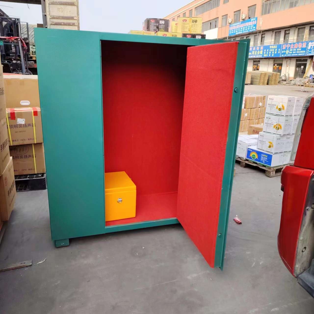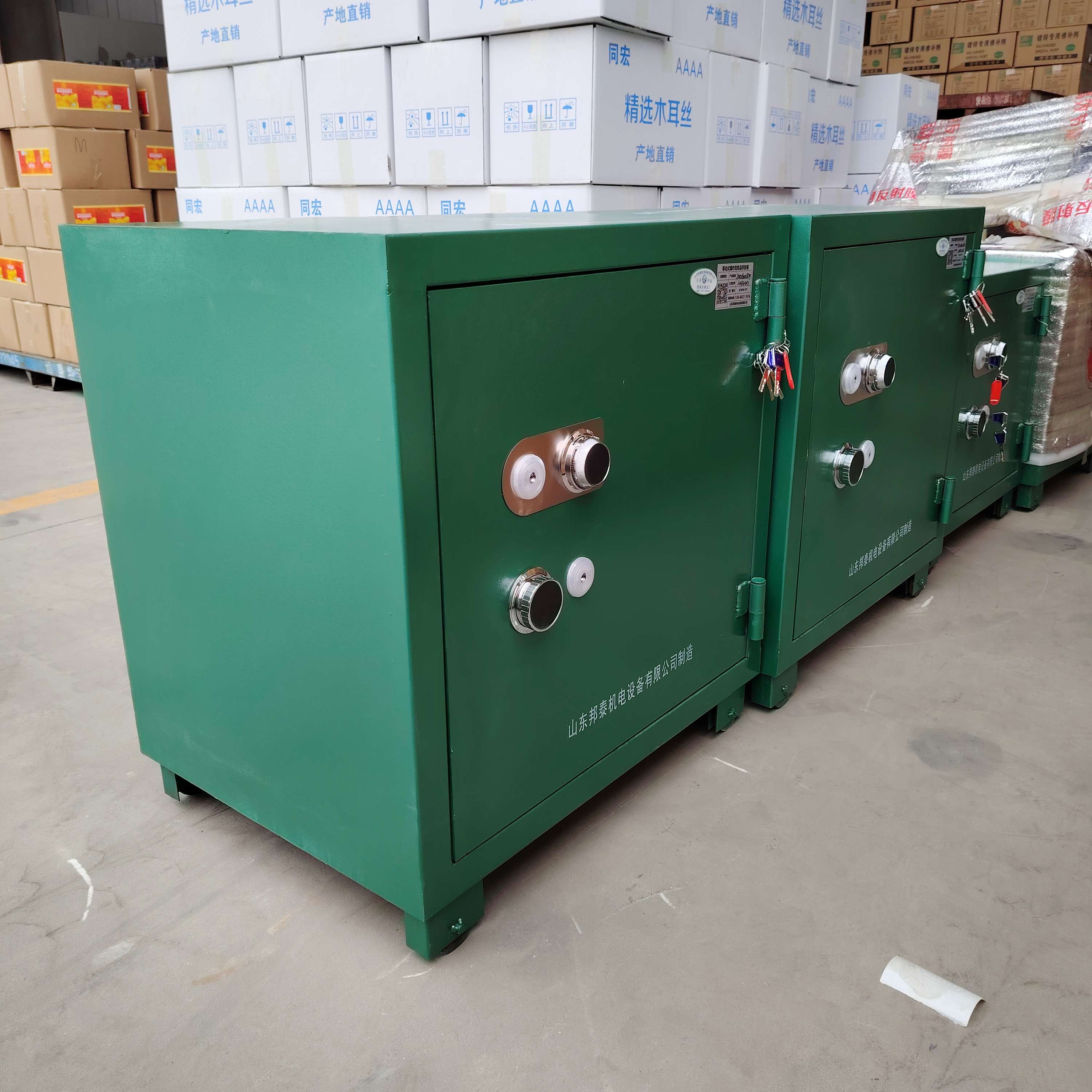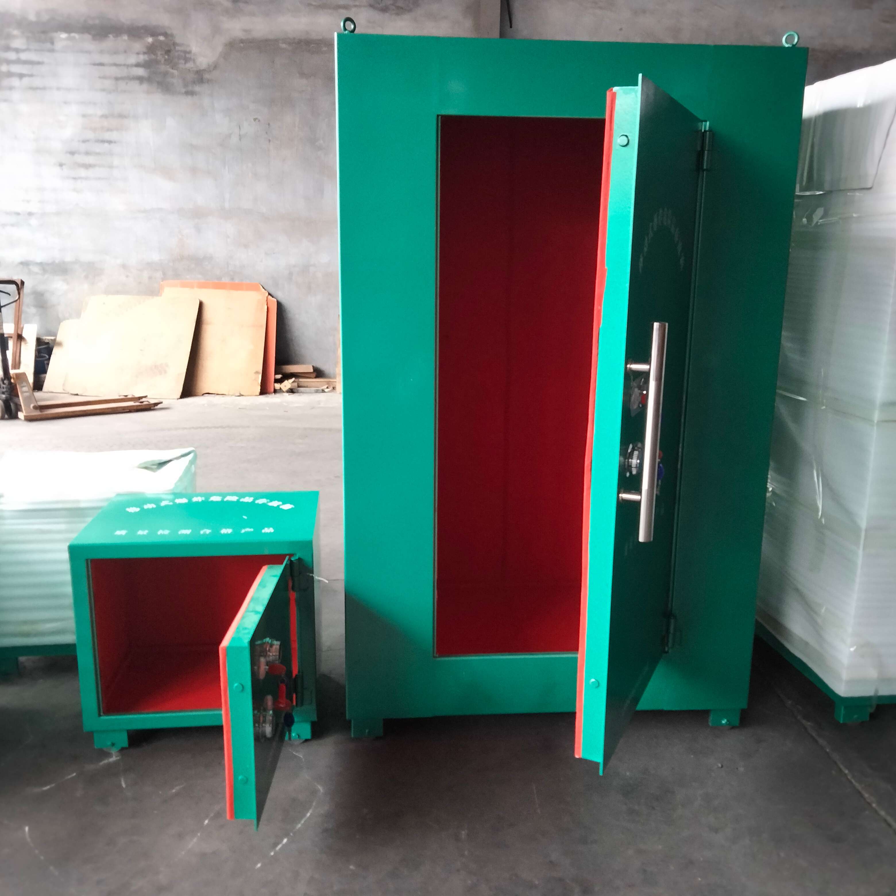 防爆鋼板柜子外層是6-8mm的防爆鋼板,內置10mm的絕緣木板和2mm的防靜電阻燃氈。也是雙鎖設置,一個轉盤密碼鎖加兩個鑰匙鎖,雙人保管更安全。門框做了加厚處理,漆面為進口噴涂流水線,高壓靜電粉體噴涂高溫烘烤,使產品色澤光亮,附著力強,具有耐腐蝕,防靜電,全方位防撬防盜的特點。