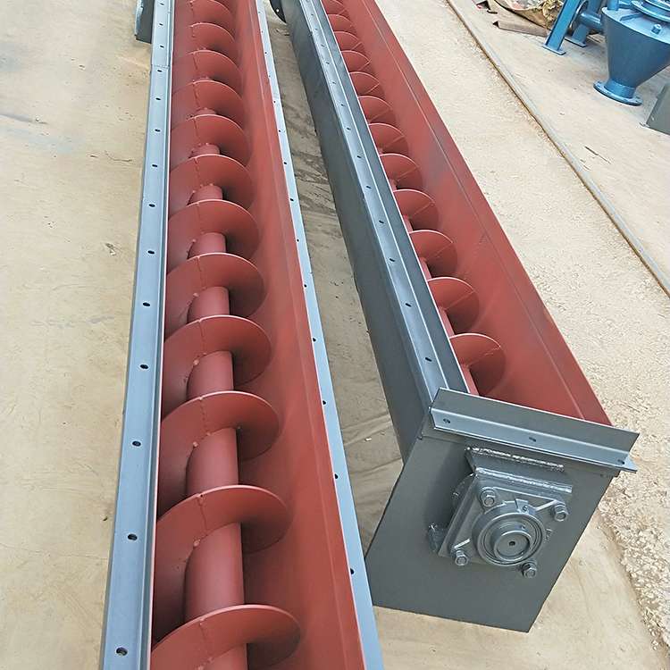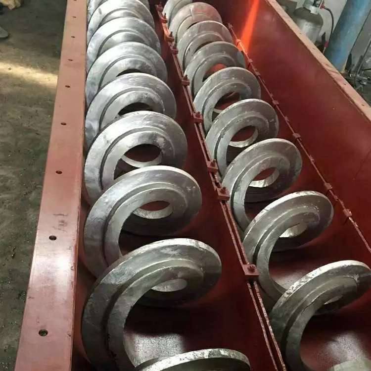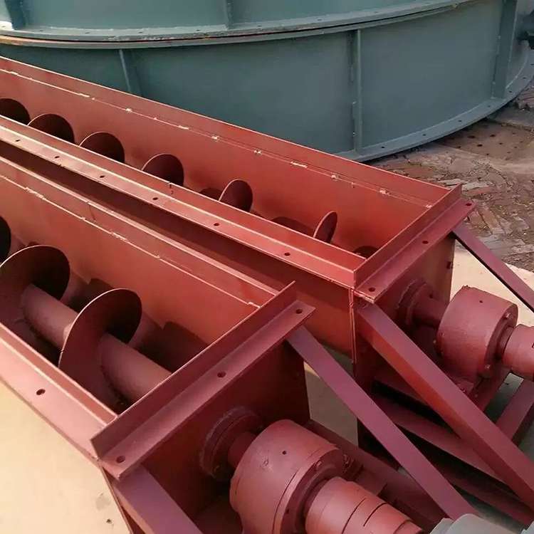 當螺旋軸轉動時,由于物料的重力及其與槽體壁所產生的摩擦力,使物料只能在葉片的推送下沿著輸送機的槽底向前移動,其情況好像不能旋轉的螺母沿著旋轉的螺桿作平移運動一樣 。物料在中間軸承的運移,則是依靠后面前進著的物料的推力。所以,物料在輸送機中的運送,完全是一種滑移運動。為了使螺旋軸處于較為有利的受拉狀態,一般都將驅動裝置和卸料口安放在輸送機的同一端,而把進料口盡量放在另一端的尾部附近。 旋轉的螺旋葉片將物料推移而進行輸送,使物料不與螺旋輸送機葉片一起旋轉的力是物料自身重量和螺旋輸送機機殼對物料的摩擦阻力。葉片的面型根據輸送物料的不同有實體面型、帶式面型、葉片面型等型式。螺旋輸送機的螺旋軸在物料運動方向的終端有止推軸承以隨物料給螺旋的軸向反力,在機長較長時,應加中間吊掛軸承