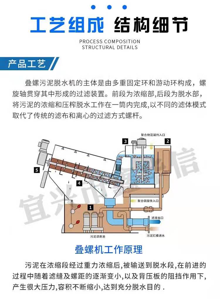 ① 脫水機的疊螺主體是由固定環和游動環相互層疊,螺旋軸貫穿其中形成的過濾裝置.前段為濃縮部,后段為脫水部。