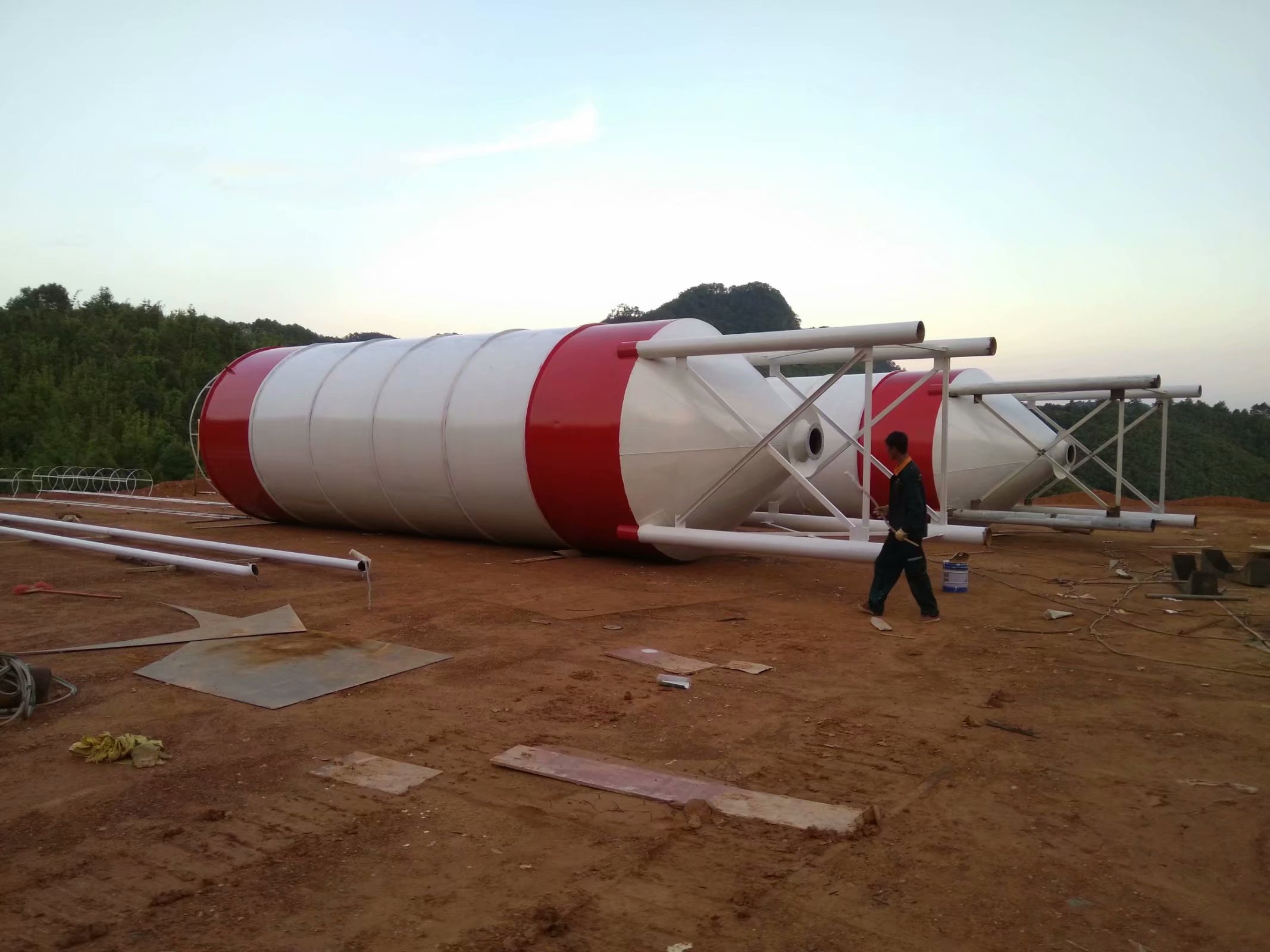 產品介紹:水泥罐(也叫散裝水泥罐、水泥倉)一般用在混凝土攪拌站的散裝水泥存儲中,水泥罐是一種封閉式的儲存散裝物料的罐體,適合儲存水泥、粉煤灰等各種散裝建筑物料,罐體上裝有料位系統,能夠顯示物料的位置和多少,破洞裝置可以解除物料沉積太久而造成的結實。水泥倉和螺旋輸送泵配合使用能夠把物料輸送到各個位置,該罐體安裝方便, 是各種攪拌站的理想散裝儲存罐。結構特點:水泥倉(水泥罐)為圓柱形結構,底部由四條圓管支腿支撐整個倉體,整倉全部為鋼結構形式,焊接而成;頂部設有除塵器及壓力安全閥。1. 水泥罐通常作為混凝土攪拌站(樓)的配套產品使用。2. 適用于裝散裝水泥及干燥的粉煤灰,具有防雨、防潮、使用方便等特點;規格尺寸也可根據客戶要求的尺寸制作。3. 一般為圓筒支架結構,其上部有除塵設備,防止粉塵泄漏,下部裝有破拱裝置,防止粉料結塊,使粉料卸出順暢,并裝有料位傳感設備,可隨時掌握倉內物料使用情況。4. 一般采用散裝水泥輸送車將粉料氣送入倉內;根據水泥倉的結構不同,卸料一般有兩種方式,一是下部與螺旋輸送機連接,用螺旋輸送機將粉料送入粉料計量,二是采用氣力輸送(對特殊結構的水泥罐)。