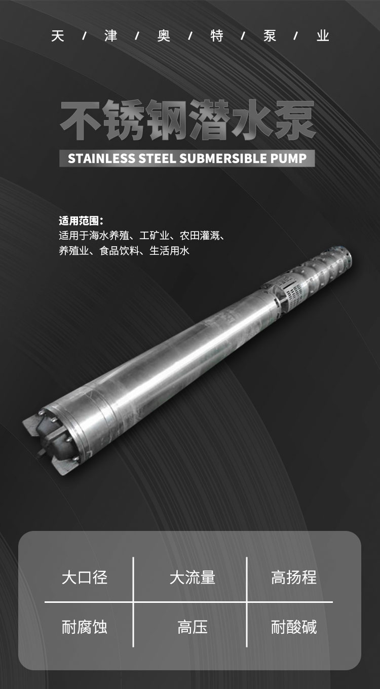 天津奧特泵業推出的不銹鋼潛水泵,采用304等材質打造,具備出色的耐磨與耐腐蝕性能。其結構設計合理,可適應多種復雜工況。 在功能方面,它動力強勁,適用于江河取水、水利工程等場景。對于大型礦坑排水、地熱深井取水以及深水水井作業,也能穩定運行。在污水排放領域,它也能可靠發揮作用,通過高揚程設計,高效完成液體提升與輸送任務,為各類工程提供穩定的抽水解決方案,是一款實用性強的工程專用設備。