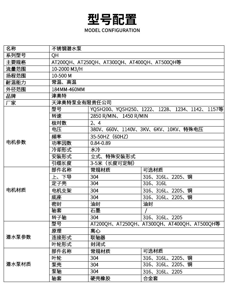 本公司不銹鋼潛水泵葉輪可選用鑄鐵 HT200 ,或耐腐蝕的不銹鋼 304、316、316L,甚至錫青銅材質,適配不同水質與工況。泵殼同樣有鑄鐵 HT200 和不銹鋼可選,堅固耐用。泵軸采用雙相不銹鋼 2205 ,或經1050℃調質處理、加強扭矩的不銹鋼 2GR13 ,保障傳動穩定性。密封采用橡膠密封 O形環與機器密封,有效防漏。適用于農田灌溉、工業取水、礦用搶險、城市供水、電廠冷卻水提取、鋼廠及井用等場景,為各類工程提供可靠的抽水解決方案。