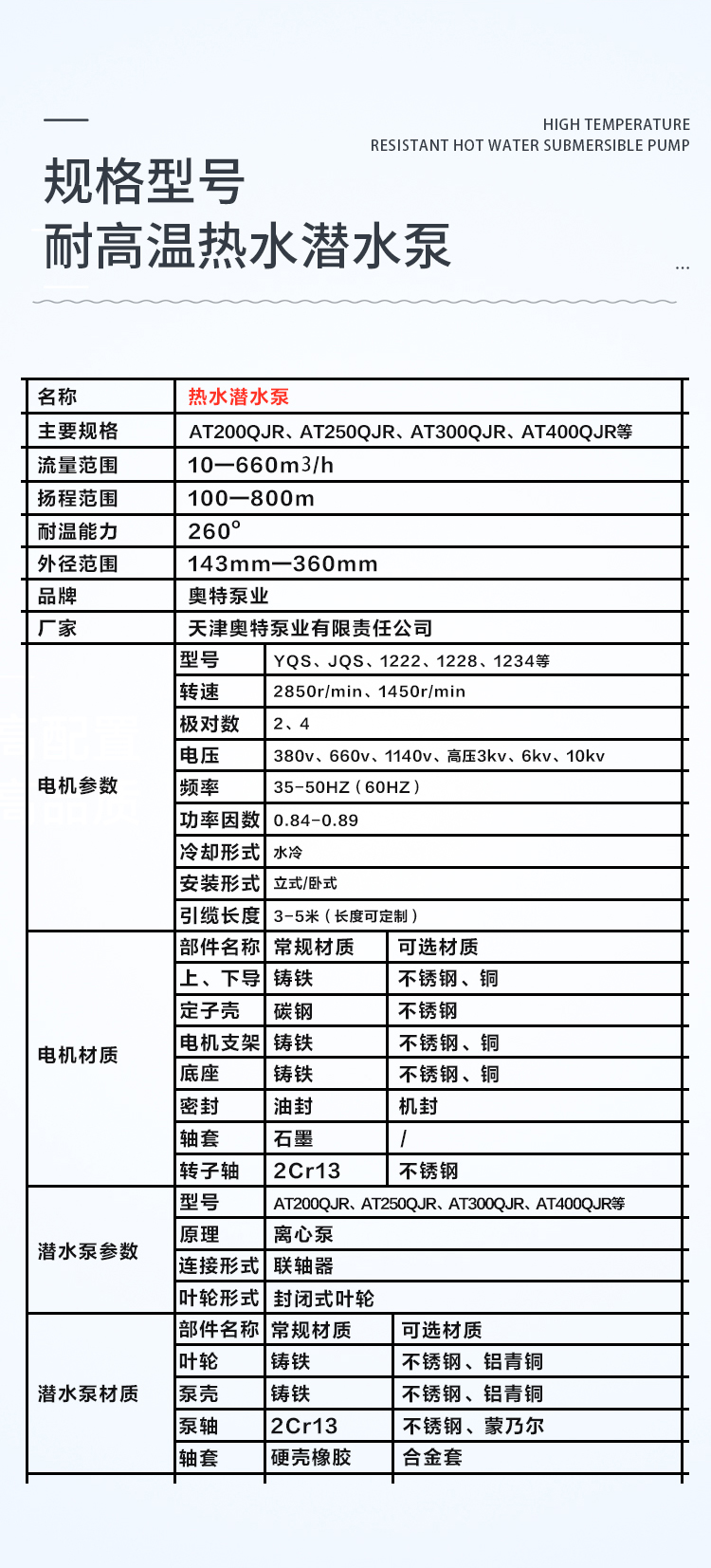 地熱井用泵作為地熱資源開發的核心設備,其性能直接關系到整個系統的效率和穩定性。天津奧特泵業有限責任公司推出的QJR熱水泵,以其高揚程、耐高溫的特性,成為地熱井和工業廢水處理領域的理想選擇。