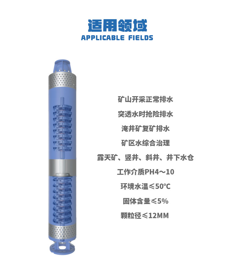 適用領域:礦山開采正常排水;突透水時搶險排水;淹井礦復礦排水;礦區水綜合治理;露天礦、豎井、斜井、井下水倉;工作介質PH4~10;環境水溫≤50℃;固體含量≤5%;顆粒徑≤12MM。