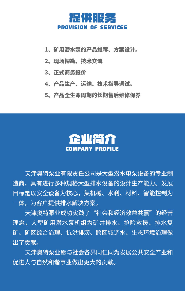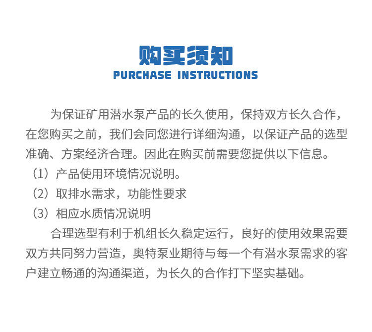 天津奧特泵業有限責任公司作為業內可靠的設備制造商,可定向根據客戶對礦用潛水泵的需求和要求進行設計出品,以客戶的需求放在首位,以產品質量作為核心,全心全意為客戶打造更好的產品體驗,謀求高質量、長遠穩定的合作關系,期待您通過所留的聯系方式進行咨詢。