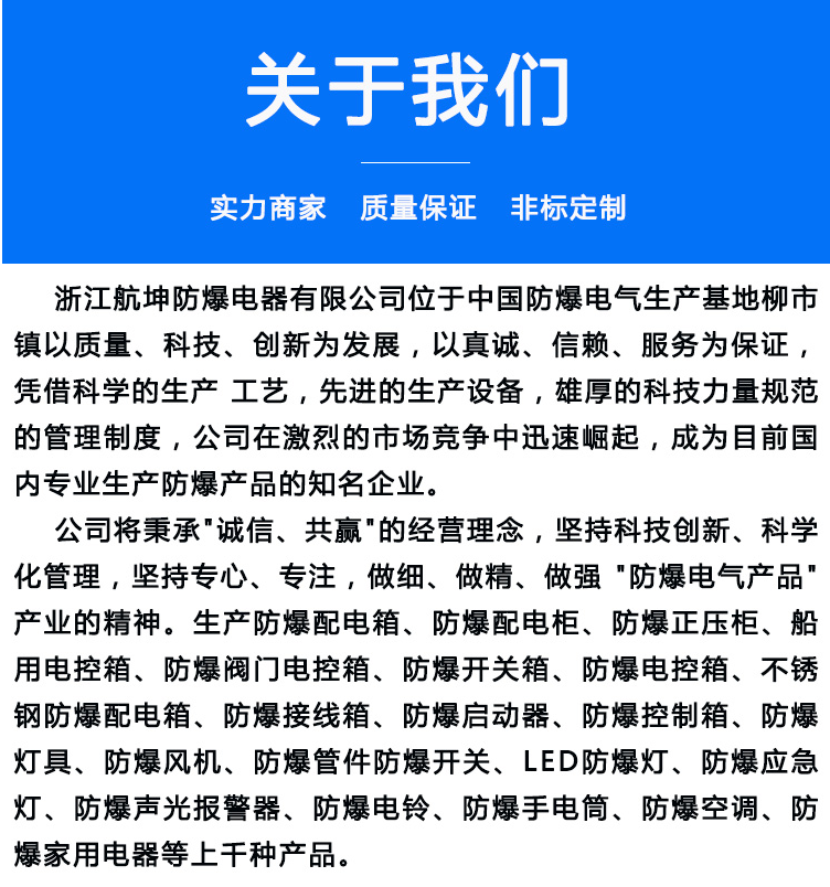 航坤防爆電器有限公司一直保持穩定、快速的增長,以管理手段制勝,產品質量制勝,人力資源制勝,營銷戰略制勝,高創造力制勝為發展總目標,持續改進的意識已被滲入到每位員工的心中,并在每一個崗位得到良好的體現和保持。企業內部,在產品開發領域,具備強大的開發能力,擁有一批掌握行業前沿技術的設計開發人員,每一項設計都能夠很好地圍繞客戶的需求,提出創造性的設計方案,滿足客戶對產品的個性化需求。