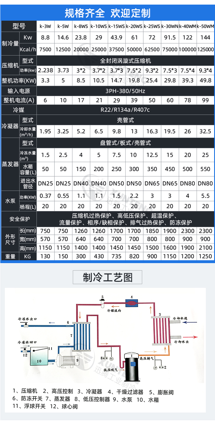 ⑧采用壓縮機(jī)過(guò)熱、過(guò)流保護(hù),高低壓保護(hù)、防凍保護(hù)、流量開(kāi)關(guān)、相序/缺相保護(hù)及排氣過(guò)熱保護(hù)等安全保護(hù)