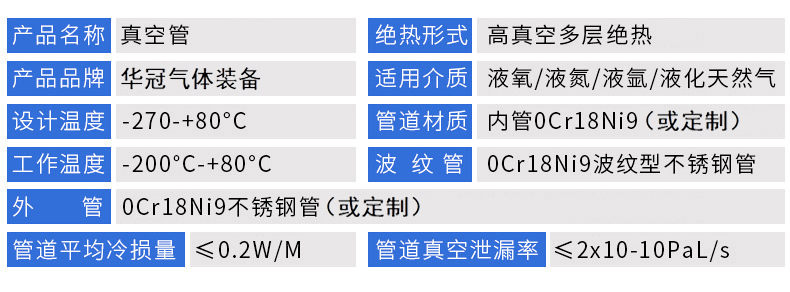 真空絕熱管道規格及主要技術參數 | |||||||||||||