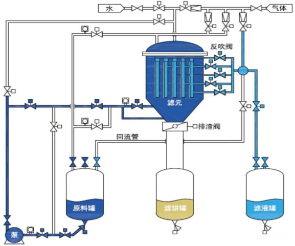 過濾結束后,過濾機內還剩一罐料液,此時出液口繼續打開,開啟正吹閥,