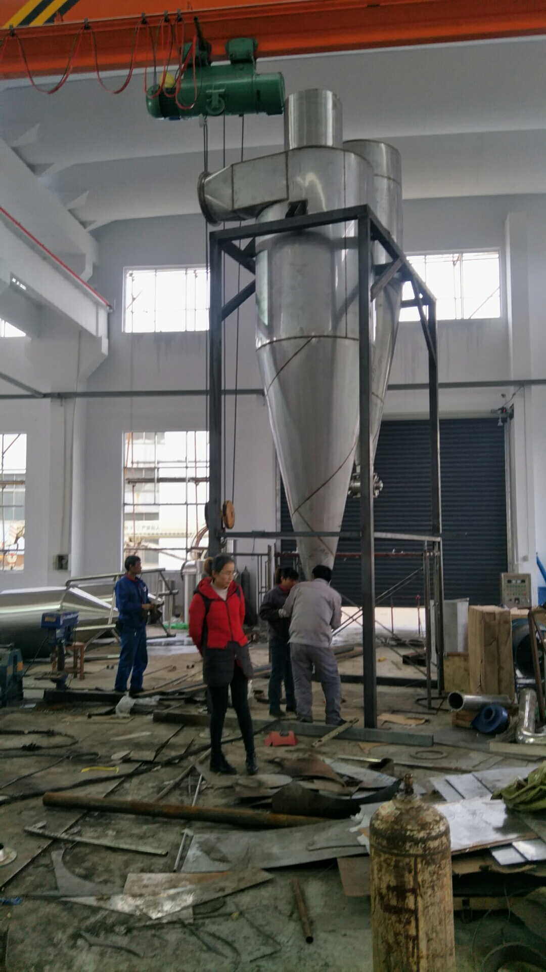 閃蒸干燥機是一種通過利用電加熱裝置將空氣升溫,使空氣溫度達到蒸發溫度,蒸發出熱量,使物料的溫度上升,使物料中的水份蒸發掉,從而達到干燥的目的的設備。在工作過程中,熱空氣切線進入干燥器底部,形成強有力的旋轉風場。物料由加料器加入主機內,在重力作用下,物料中較重的部分會先行下落,然后在高速旋轉打散裝置作用下,物料會得到分散,其中塊狀物料可以迅速粉碎,最終成為較輕的物料,然后隨底部旋轉向上的熱風而上升,期間會熱風充分接觸、受熱、干燥。最后干燥好的物料會被旋風分離器和布袋除塵器收集,潔凈的尾氣則被引風機排到空氣中,完成整個干燥流程1。