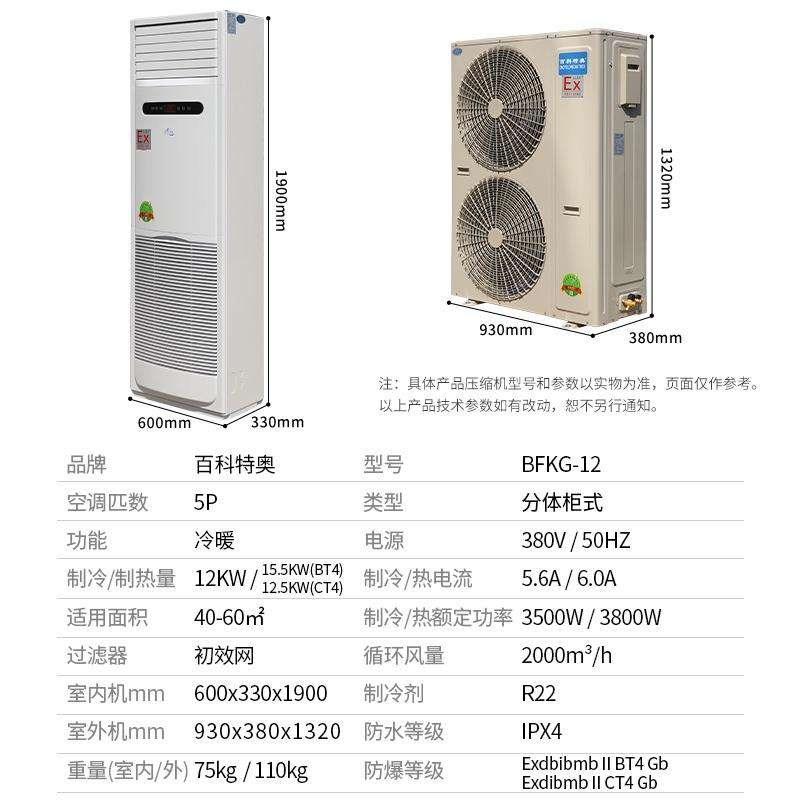 衢州防爆空調,百科特奧5匹衢州防爆空調BFKG-12,防爆空調外觀基本和家用空調差不多,防爆空調主要是對空調進行改裝,對線路板以及其他部分進行密封處理。具有高效節能、低噪音、高溫、低溫、特高溫、特低溫、制冷制熱和自動除霜等優點,可通過用戶需求定制單冷或冷暖型改裝。普通空調在具有爆炸性氣體混合物存在的石油化工等危險場所,一旦發生易燃易爆氣體泄漏,就有可能發生爆炸危險。具體可能發生爆炸的因素有以下幾個方面:元件、設備所產生的電火花、電弧等,如控制回路中的接觸器、繼電器。該類防爆產品可應用于石油化工、物流、車間、冶金、紡織、食物、生物工程、醫藥、港灣棧房和特殊工程等爆炸性環境中,有溫度控制要求的場合;1區、2區危險氣體處所,IIA、IIB、IIC類T1-T4組爆炸性氣體或蒸汽環境。百科特奧防爆空調掛式柜式 防爆等級:ExdbibmbIIBT4Gb/ExdibmbIICT4Gb可選。