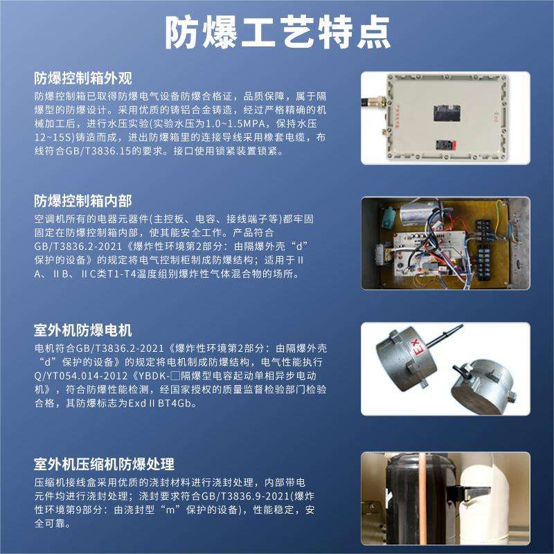 徐州防爆空調,百科特奧2匹徐州防爆空調BFKT-5.0 http://www.ex-fbkt.com系列機型通過特殊防爆技術加工處理,可廣泛應用于1區、2區防爆級別,涵蓋、科研、石油、化工、醫藥、加工制造、生物制藥等多種行業,為存在ⅡA、ⅡB級,T1~T4組可燃性氣體、蒸汽與空氣混合形成的易引發爆炸的危險場所,是針對有溫度控制要求場所設計的特種調溫空調設備,系列產品均通過國家防爆電氣產品質量監督檢測中心檢驗,獲得國家防爆電氣設備防爆合格證:防爆空調機其外形美觀,設計合理并具有安裝維修方便等特點,全系列防爆產品內部采用壓縮機、微電腦控制、數字顯示,具有噪聲低、性能穩定、操作簡便等優點。深受廣大特需行業客戶喜愛,并以部分錄入特需行業采購名錄。