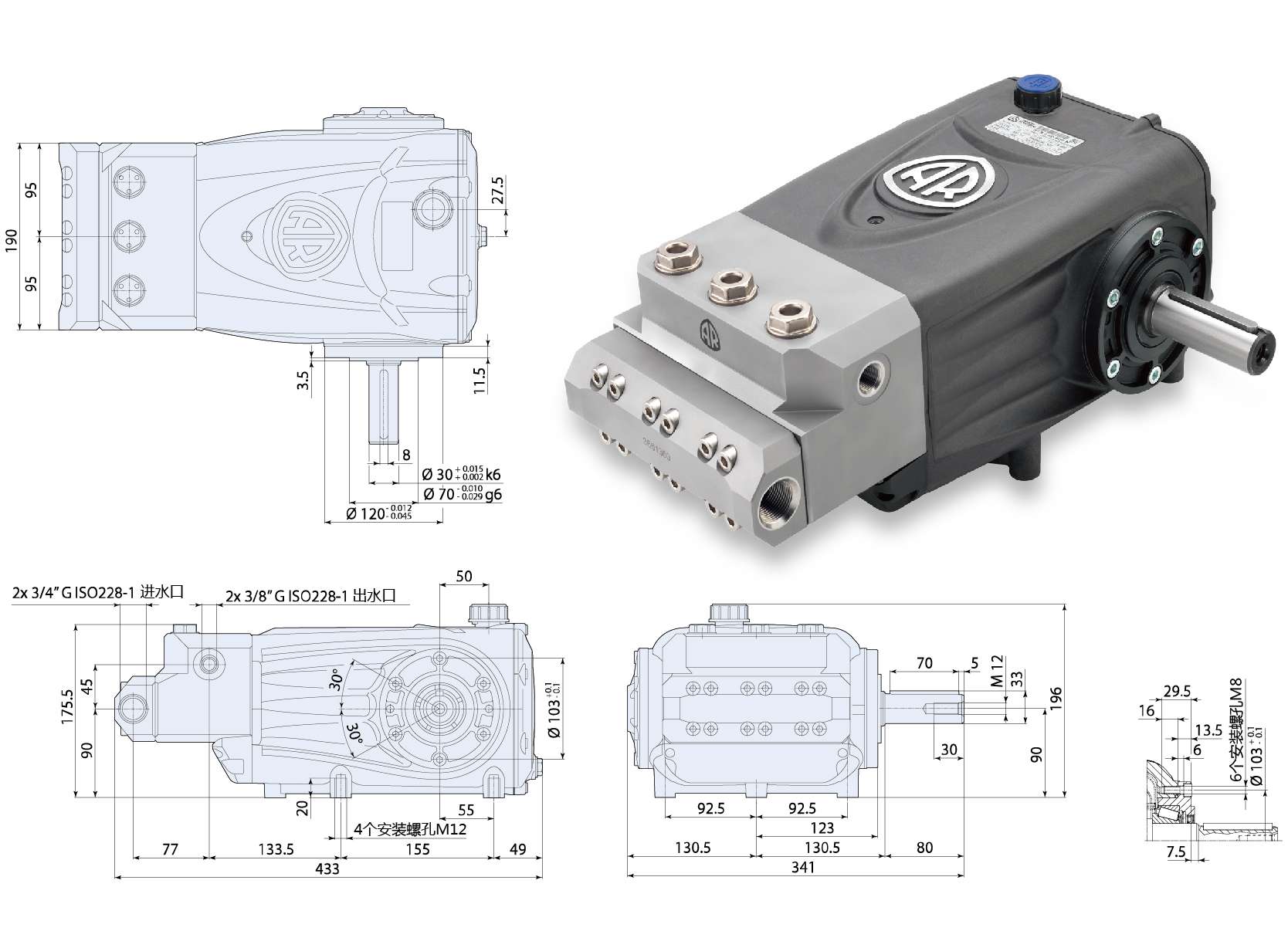 RGL41.20(完整型號:RGL41.20N) 是意大利 AR(Annovi Reverberi) 三柱塞臥式高壓柱塞泵,主打大流量、中高壓,用于工業(yè)清洗、市政疏通、造霧、養(yǎng)殖場清潔等場景。 一、核心參數(shù)(標(biāo)準(zhǔn) 1450rpm) 流量:41 L/min(2.46 m3/h) 額定壓力:200 bar(20 MPa) 轉(zhuǎn)速:1450 rpm(標(biāo)準(zhǔn)電機(jī)轉(zhuǎn)速) 匹配功率:16 kW(380V 三相) 柱塞數(shù):3 柱塞(陶瓷柱塞,耐磨) 泵頭材質(zhì):鍛黃銅 進(jìn)水口:3/4" 內(nèi)螺紋 出水口:3/8&qu
