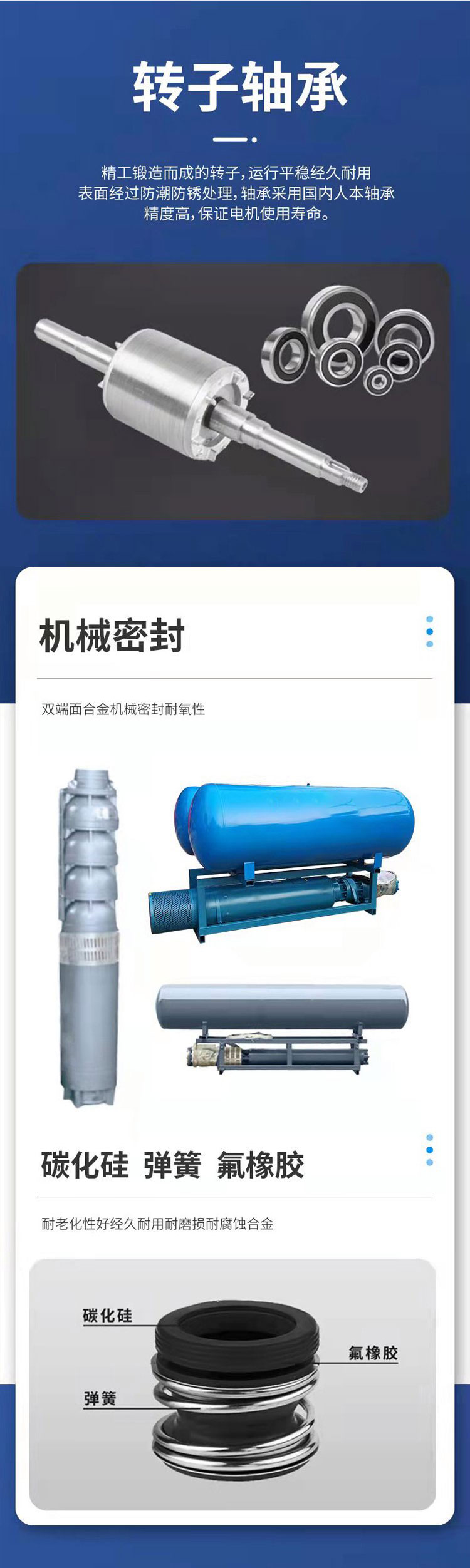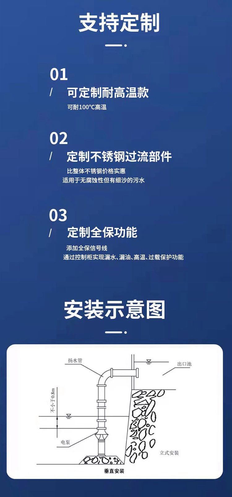 一、 產品概述 QJ系列潛水泵是一種立式、多級、離心式潛水泵。它與潛水電機直接耦合,組成一個整體,完全潛入水下工作。其核心設計目的是為了從幾十米到數百米深的地下水中高效、穩定地提水。 主要特點: 高效節能: 多級葉輪設計,提供高揚程的同時保持較高效率。 結構緊湊: 泵與電機一體,占地面積小,無需地面泵房。 安裝維護簡便: 通過電纜和輸水管吊裝到井下,維護時整體提出即可。 運行穩定、壽命長: 水下運行噪音低、無汽蝕問題,設計壽命長。 適用性強: 可通過選用不同材質和配置,適應多種水質。 二、 主要結構與工作原理 泵體部分: 由進水段、多級導流殼/中段(內含葉輪)、出水段組成。每一級葉輪都能增加一定的壓力和速度,級數越多,總揚程越高。 潛水電機部分: 位于水泵下方,為專用的充水式密封潛水三相異步電動機。電機內腔充滿純凈的冷卻水/潤滑劑,用于絕緣、冷卻和潤滑軸承。 密封系統: 這是潛水泵的關鍵,通常包括機械密封(或油封)組,嚴格防止水進入電機內部,確保電機安全。 保護系統: 泵會配備過熱、過載、漏水、缺相等保護傳感器,集成于電機或控制柜中。 附屬部件: 包括潛水電纜、揚水管(鋼管或PVC管)、吊裝索和控制柜。 工作原理: 通電后,潛水電機帶動軸上的多級葉輪高速旋轉。水從泵底部的濾網進入,經每一級葉輪逐級加壓,動能和壓能不斷增加,從泵頂部的出口流出,通過揚水管輸送到地面。