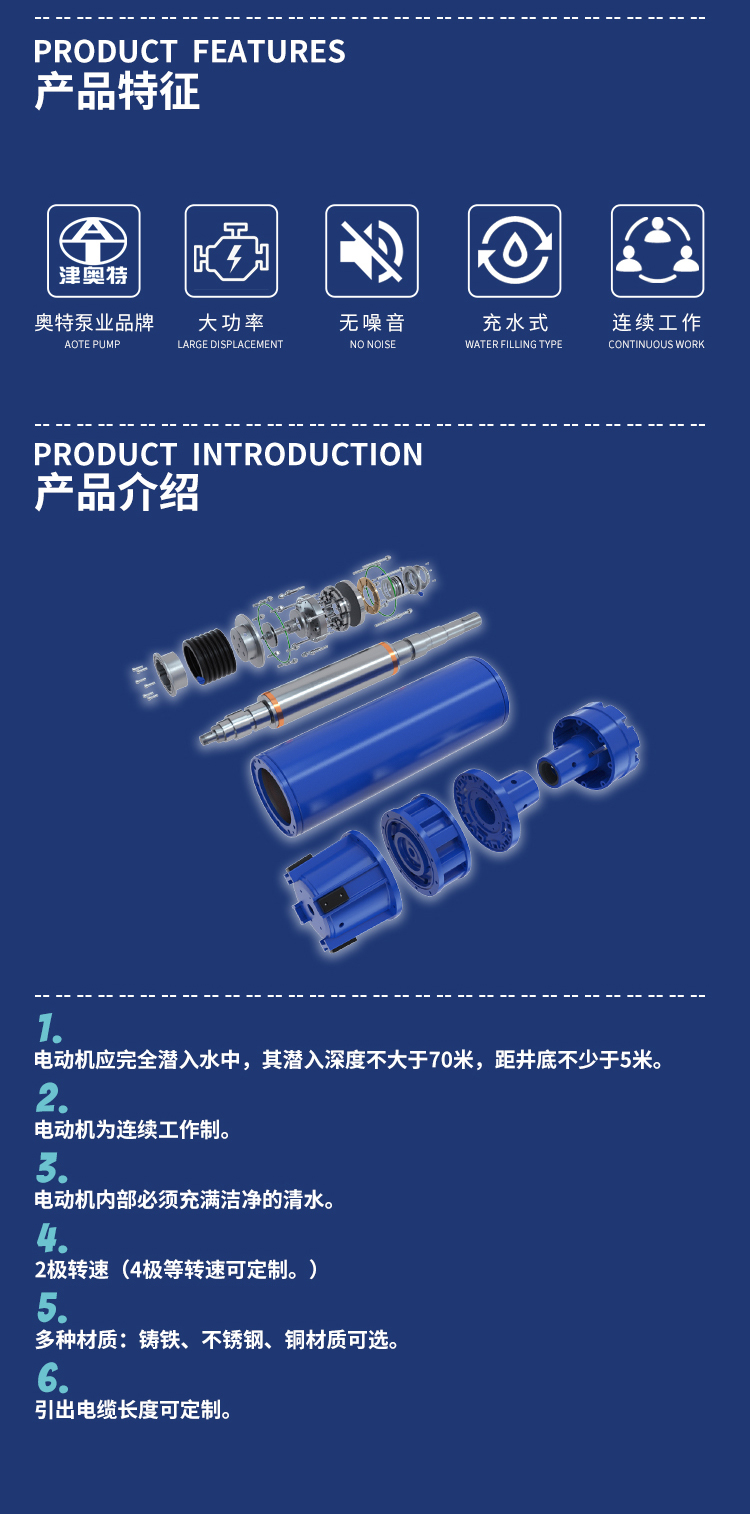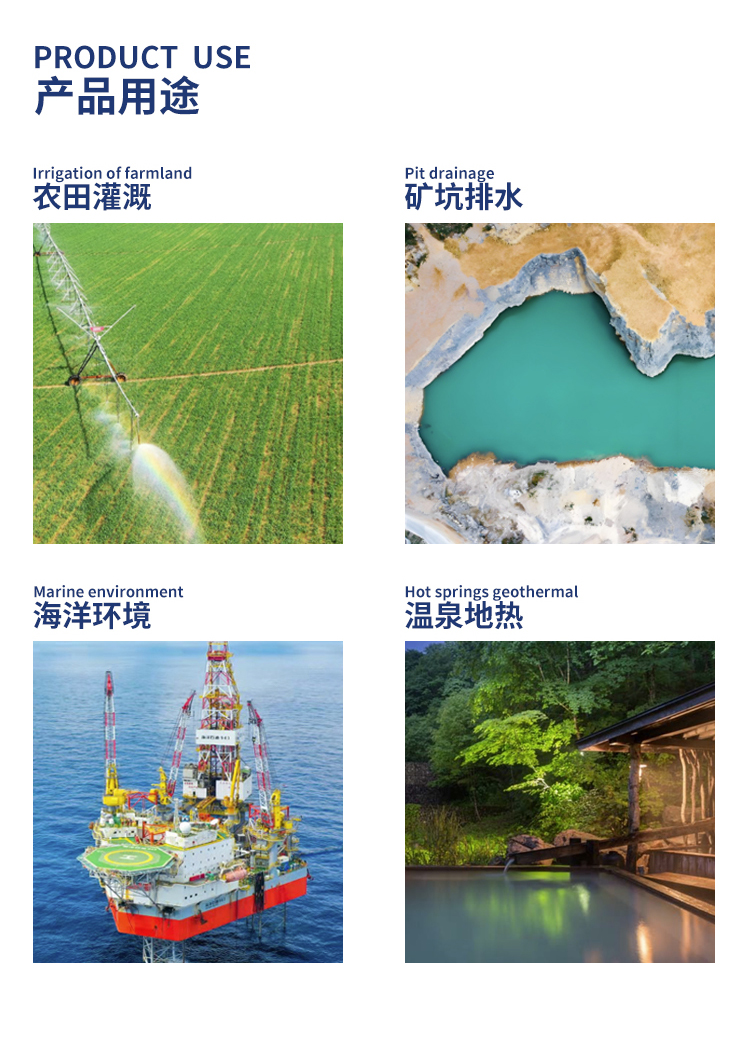 內腔: 充滿冷卻/潤滑介質。 冷卻套/過濾網: 外部有時配有套筒,引導水流循環冷卻并過濾大顆粒雜質。 四、主要應用領域 農業深井灌溉 工礦企業供水 城鄉生活用水提取 高原、山區人畜飲水工程 地下水監測與利用 礦山排水、搶險排水 江河、水庫提水