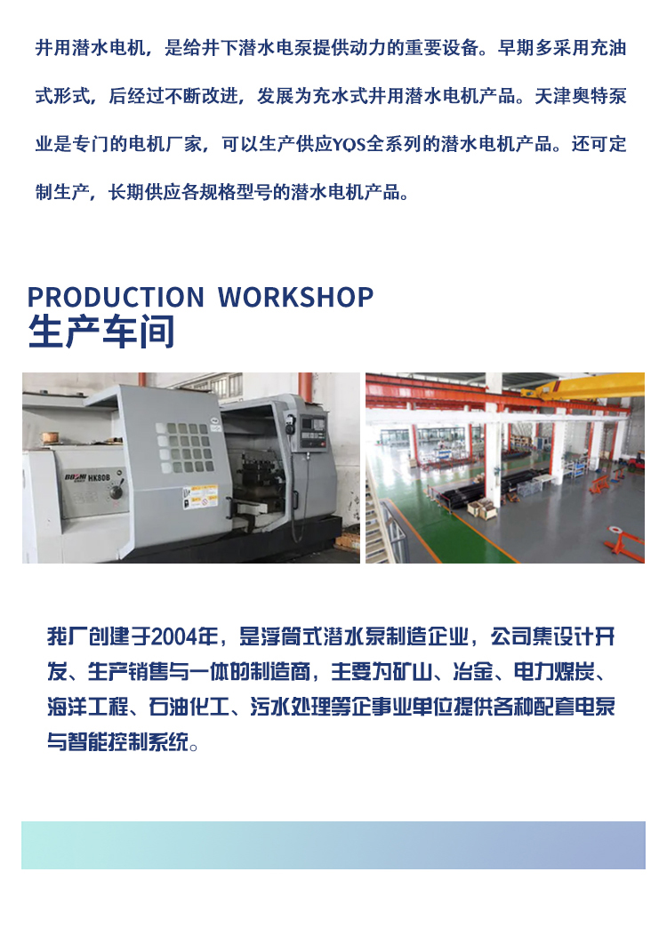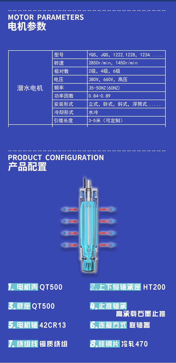 一、概述 YQS系列是一種專門設計的 三相異步潛水電機,通常與潛水泵(如井用潛水泵、河流抽水泵等)耦合組成潛水電泵機組,廣泛應用于深井、河流、湖泊等場合的提水和灌溉作業。其核心特點是 “大功率” 與 “防腐蝕” ,能夠在惡劣的水下環境中長期、可靠、高效運行。 二、主要特點 防水與防腐蝕性能 密封結構:采用多重機械密封(通常為兩道以上材質密封),有效防止水沙侵入電機內部。 防腐蝕材料:關鍵部件如軸、緊固件等采用不銹鋼(如2Cr13或更高等級) 制成。機殼、端蓋等通常進行特殊的防銹處理,如環氧樹脂噴涂或采用耐腐蝕鑄鐵/合金。 電纜密封:動力電纜引出處有特殊的密封接頭,確保連接點防水。 適應大功率與深井運行 高效散熱:電機直接浸沒在水中,利用周圍水流進行高效冷卻,解決了大功率電機在狹小井筒內的散熱難題,允許其設計功率可達數百千瓦。 細長型設計:為適應深井的有限直徑,電機通常設計為細長圓柱形,直徑小、長度大,功率密度高。 耐高壓設計:用于深井時,電機需承受高水壓,結構經過強化,密封和殼體具有很高的承壓能力。 內部充水與特殊防護 充水式設計(核心特征):電機內腔充滿潔凈的清水或特制的防銹潤滑液。這既能冷卻繞組,又能平衡內外壓力,防止井水滲入。 繞組與軸承保護:繞組采用防水絕緣導線,并經過特殊的絕緣防水封裝工藝。軸承采用水潤滑滑動軸承(如石墨軸承、工程塑料軸承)或耐水油脂潤滑的滾動軸承,適應水中工作。 可靠性與長壽命 設計簡單堅固,無外部風扇等易損件。 過載能力和啟動性能好,適合頻繁啟動的抽水工況。 三、基本結構 一臺典型的YQS系列潛水電機自上而下主要包括: 上接頭: 用于與水泵連接。 上軸承組件: 承受徑向力。 定子組件: 采用防水電磁線和絕緣系統。 轉子組件: 通常為籠型轉子。 下軸承組件: 通常為主要推力軸承,承受水泵產生的軸向力和轉子重量。 止推軸承: 關鍵部件,專門承受巨大的軸向推力。 機殼與端蓋: 承壓和防護主體。 電纜引出裝置: 帶密封格蘭頭。