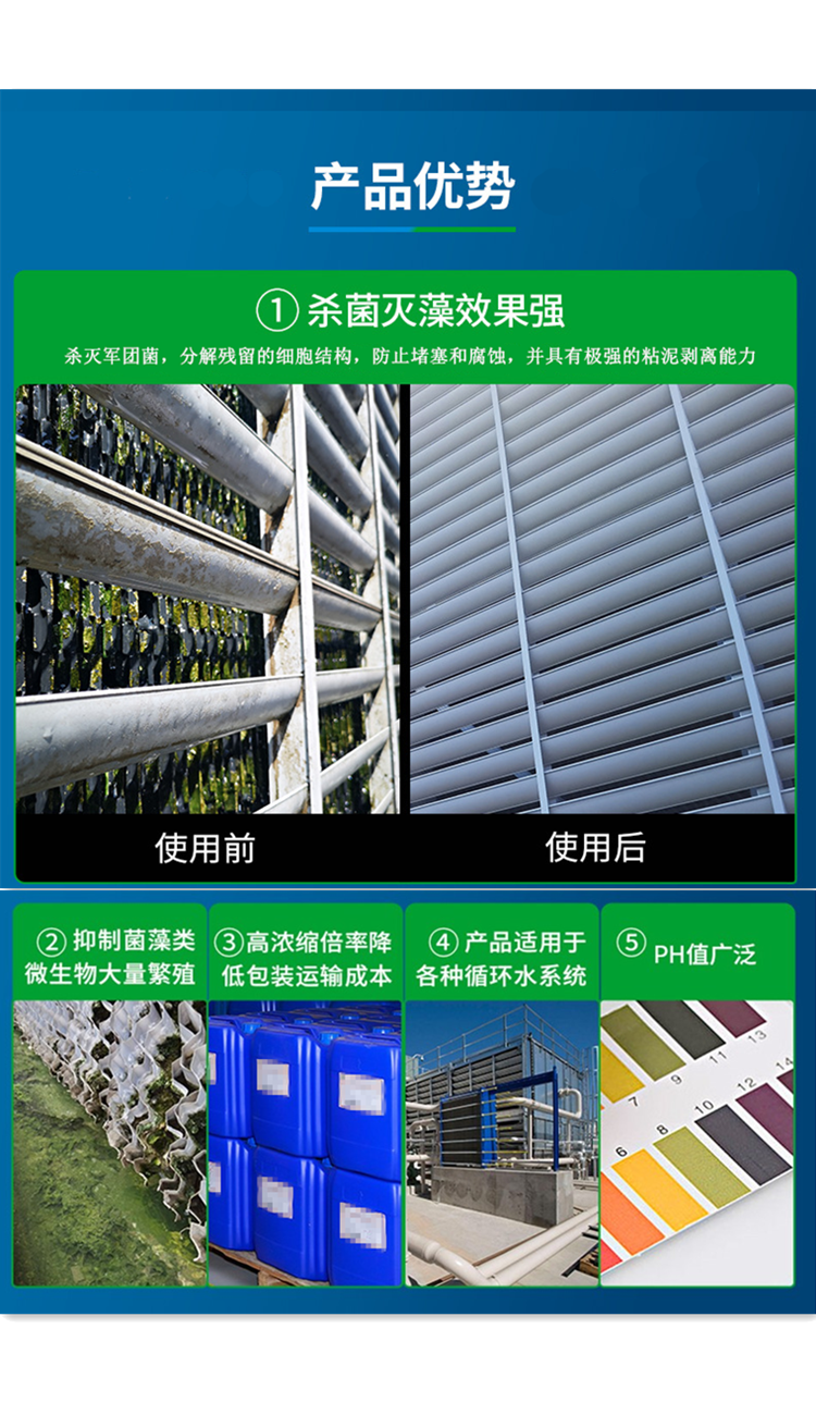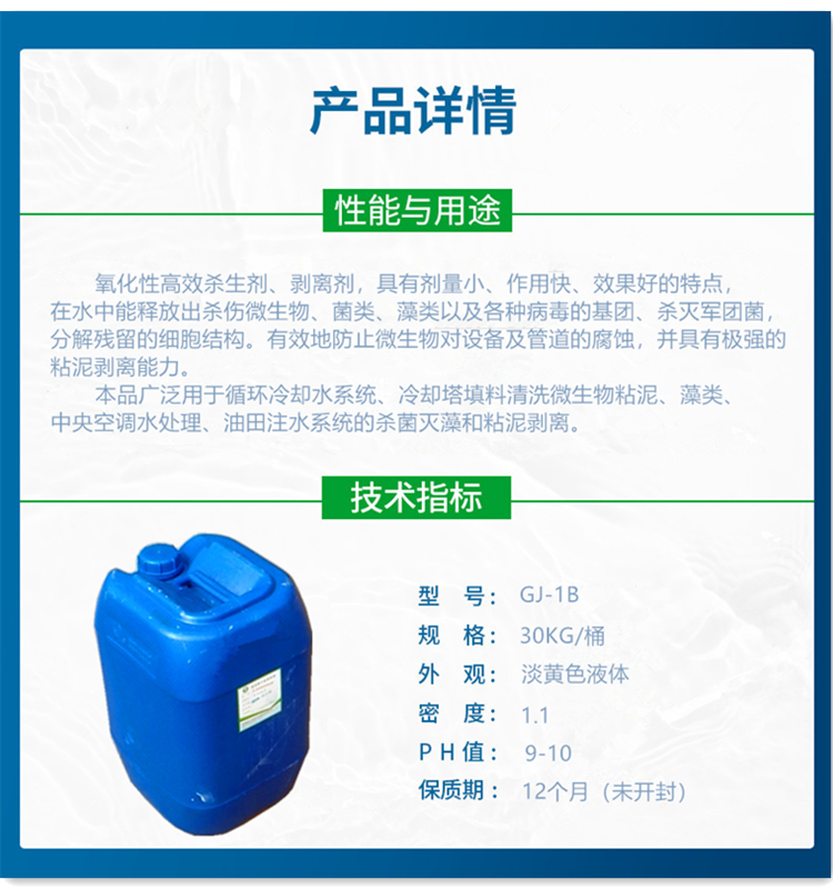GJ-1B由氧化性殺菌劑、粘泥剝離劑、表面活性劑和強(qiáng)力滲透劑組成,具有快速滲透、殺滅微生物(如菌類、藻類、軍團(tuán)菌等)并分解殘留細(xì)胞結(jié)構(gòu)的能力,同時(shí)剝離粘附在管道和設(shè)備表面的生物粘泥和軟垢。