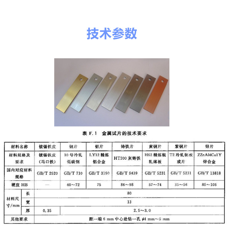 制動(dòng)液腐蝕試片是用來(lái)評(píng)定制動(dòng)液對(duì)金屬的腐蝕性。符合GB 12981-2012《機(jī)動(dòng)車(chē)輛制動(dòng)液》附錄F中制動(dòng)液金屬疊片腐蝕檢驗(yàn)法的技術(shù)要求,標(biāo)準(zhǔn)中規(guī)定七種典型金屬試片,分別為:鍍錫鐵皮(馬口鐵)、10#冷軋鋼片、LY12鋁片、HT200灰鑄鐵片、H62黃銅片、T2紫銅片、ZZnA14Cu1Y鋅片。