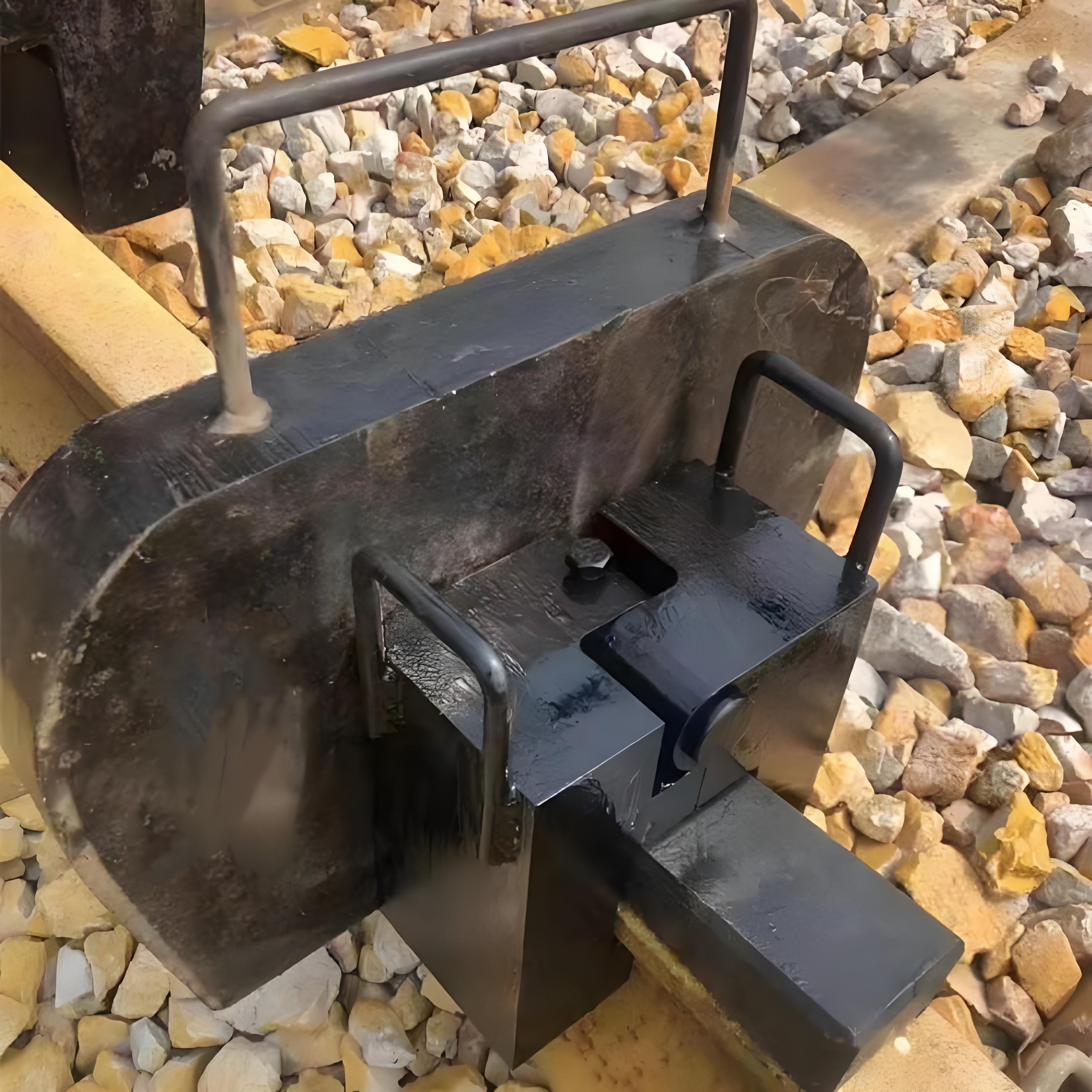 ?鐵路撞軌器?是一種用于鐵路長鋼軌在進行無縫線路聯合接頭焊接施工和無縫線路應力放散時的輔助機具。其主要作用是通過“鋼軌人力滑車”撞擊撞軌器,使長鋼軌進行縱向移動,從而調整軌縫作業?。