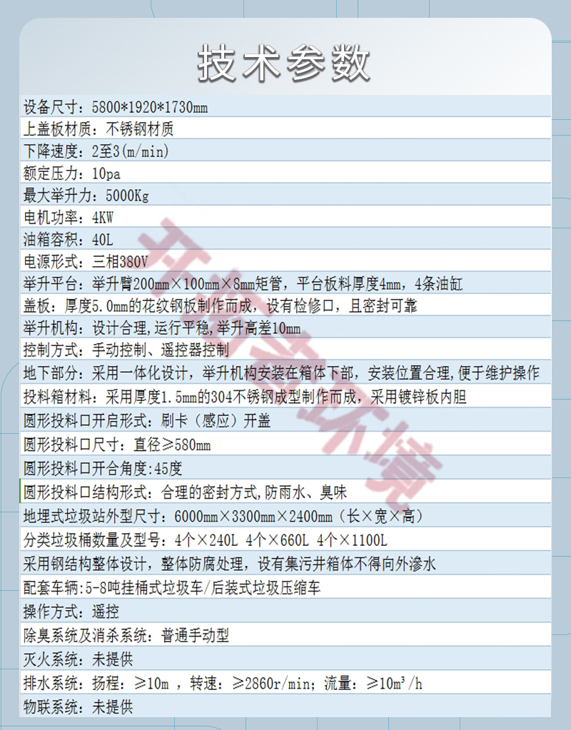 分類地埋式垃圾站又稱“景觀式垃圾分類投放箱”,是一種符合國內全新概念的垃圾分類投放暫存公共環衛設施,垃圾投放口設計為不銹鋼材質,地面以上只露出投料器與花紋蓋板,升降平臺及垃圾桶隱藏地面以下,垃圾投放后完全密閉存放,有效降低異味散發;當垃圾滿桶后,對垃圾進行收集,通過控制系統將分類垃圾桶升到地面,然后翻卸至環衛車輛,根據分好類的垃圾,分別運送至廢品資源回收站、垃圾中轉站、焚燒發電廠、填埋場所等不同場所。