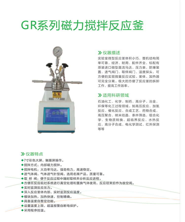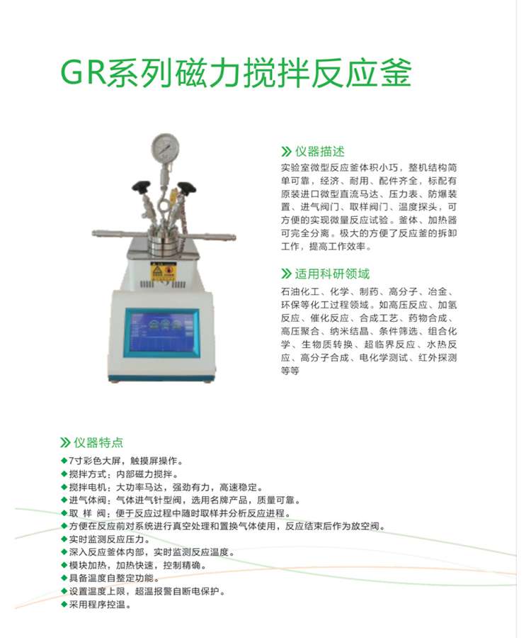實驗室微型反應釜體積小巧,整機結構簡 單可靠,經濟、耐用、配件齊全,標配有 原裝進口微型直流馬達、壓力表、防爆裝 置、進氣閥門、取樣閥門、溫度探頭,可 方便的實現微量反應試驗。釜體、加熱器 可完全分離。極大的方便了反應釜的拆卸 工作,提高工作效率。