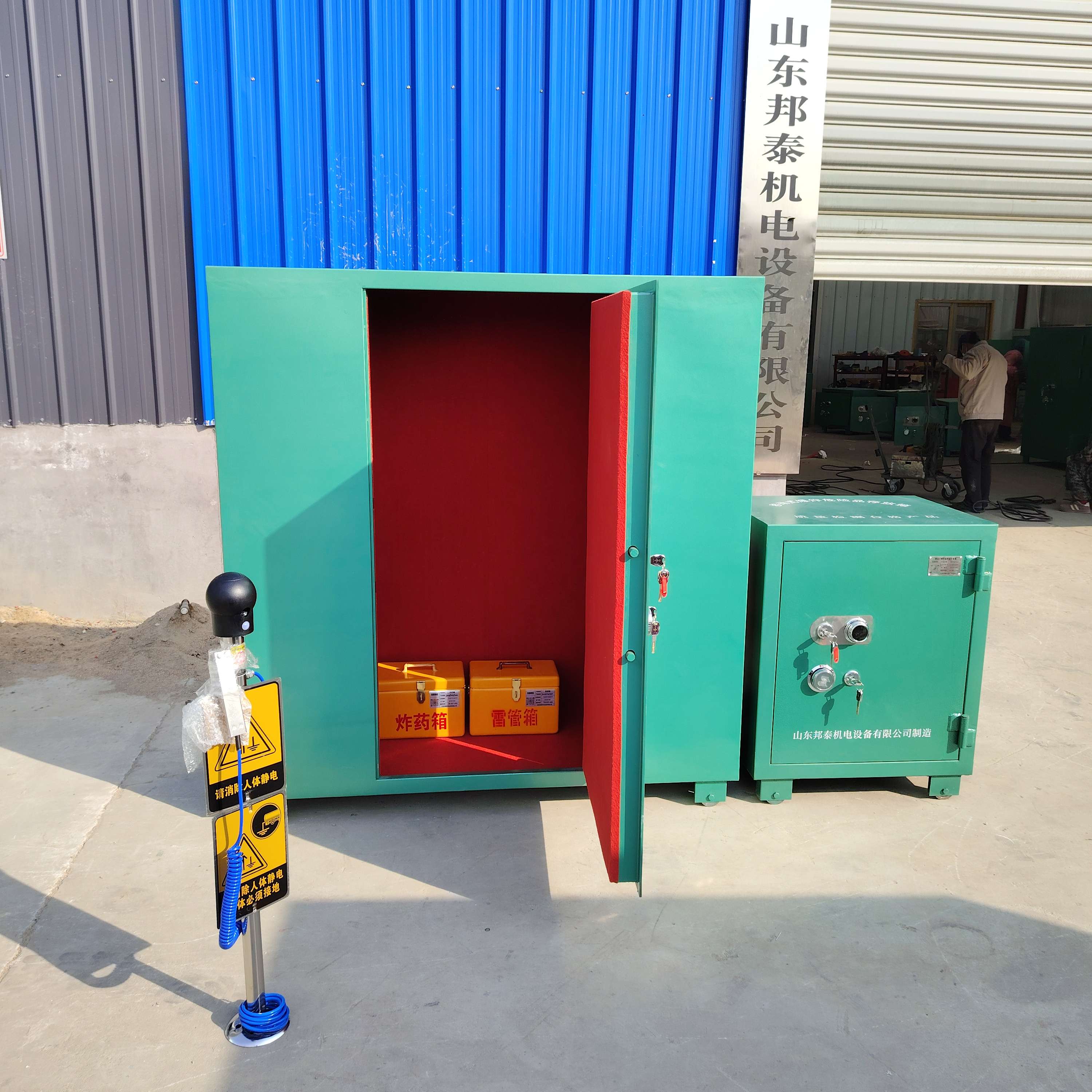 柜子的外體是采用6mm防爆鋼板,內置10mm絕木板,內部鋪設抗震防靜電阻燃氈。因移動火工品柜是放置在室外露天使用,為增強其防盜作用,柜體的鎖具采用的是GA機械雙鎖,即兩把機械鎖和一把三位密碼機械轉盤鎖。其中,爆破員保管1號鑰匙和密碼,庫管員或安全員保管2號鑰匙,共同打開后,才能領取