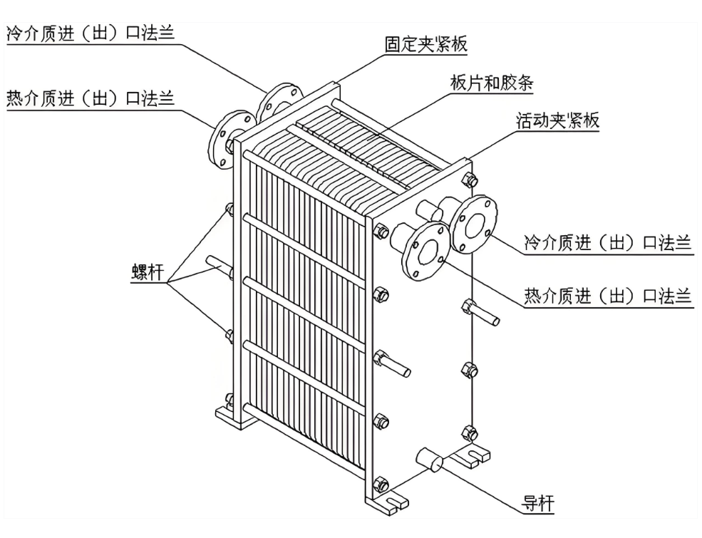 板式換熱器是近幾十年來得到發(fā)展和廣泛應用的一種新型高效、緊湊的熱交換器,它由一系列互相平行、具有波紋表面的薄金屬板相疊然后用夾板、螺栓緊固裝配的一種換熱器。冷熱兩種工作流體相間在每兩塊相鄰板片組成的狹小而曲折的通道中流過,并通過間隔冷熱流體的板片進行冷熱交換。