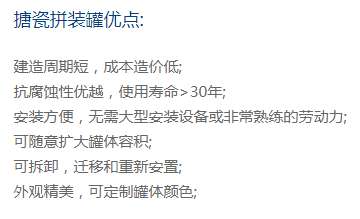 搪瓷拼裝罐是由專用搪瓷鋼板、箍筋、自鎖螺栓、密封膠等配件現場組裝而成。