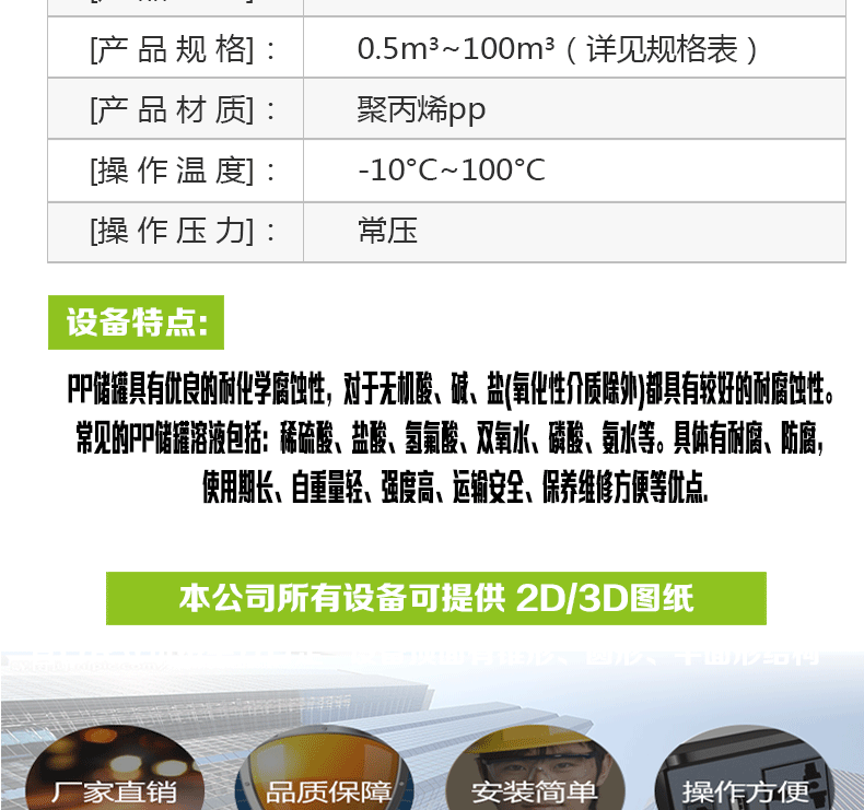 PP儲(chǔ)罐具有優(yōu)良的耐化學(xué)腐蝕性,對(duì)于無(wú)機(jī)酸、堿、鹽(氧化性介質(zhì)除外)都具有較好的耐腐蝕性。常見的PP儲(chǔ)罐溶液包括:稀硫酸、鹽酸、氫氟酸、雙氧水、磷酸、氨水等。具體有耐腐、防腐,使用期長(zhǎng)、自重量輕、強(qiáng)度高、運(yùn)輸安全、保養(yǎng)維修方便等優(yōu)點(diǎn).