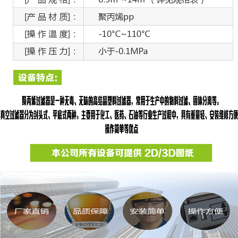 我公司生產(chǎn)的聚丙烯過濾器是一種無毒、無味的高結(jié)晶塑料過濾器,常用于生產(chǎn)中的物料過濾、固體分離等。真空過濾器分為封頭式、平底式兩種。主要用于化工、醫(yī)藥、石油等行業(yè)生產(chǎn)過程中,具有重量輕、安裝維修方便、操作簡單等優(yōu)點(diǎn)。