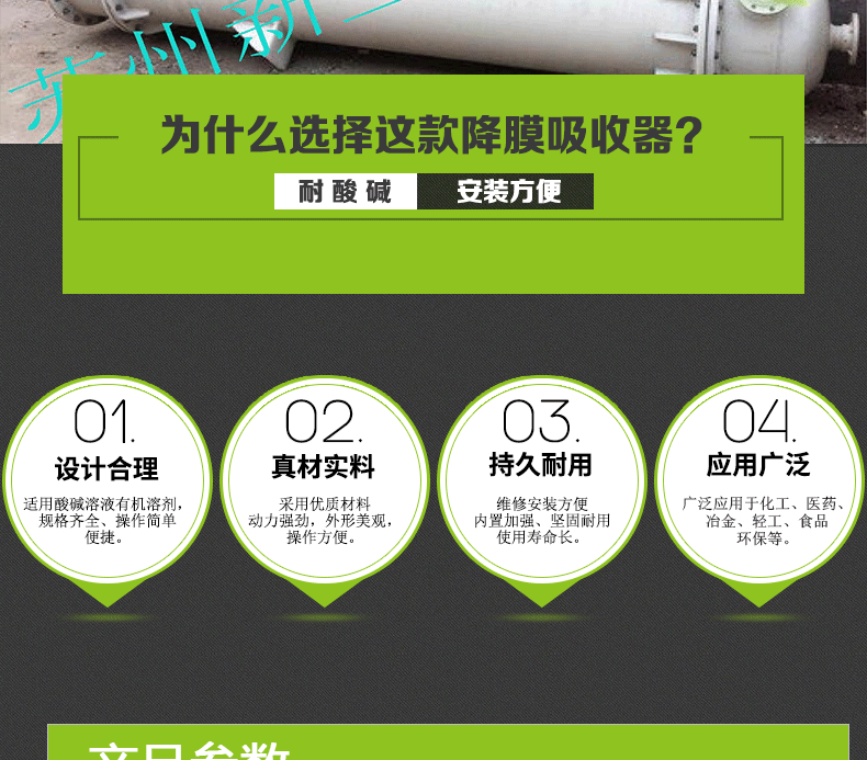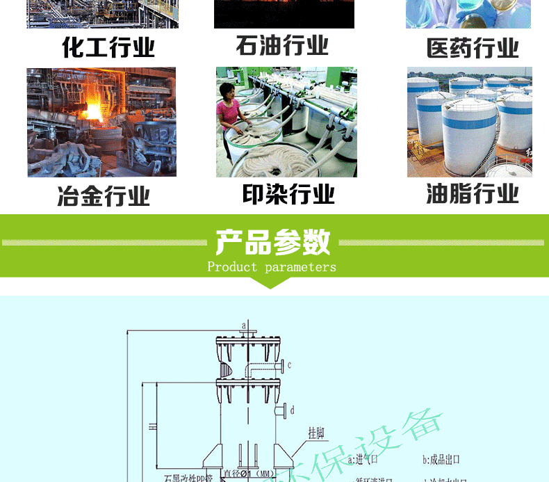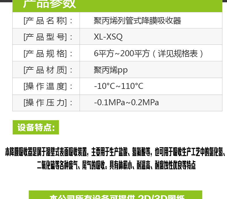 本降膜吸收器是屬于濕壁式表面吸收裝置,主要用于生產鹽酸、氫氟酸等,也可用于吸收生產工藝中的氯化氫、二氧化硫等各種廢氣、尾氣的吸收。具有體積小、耐溫高、耐腐蝕性優良等特點。