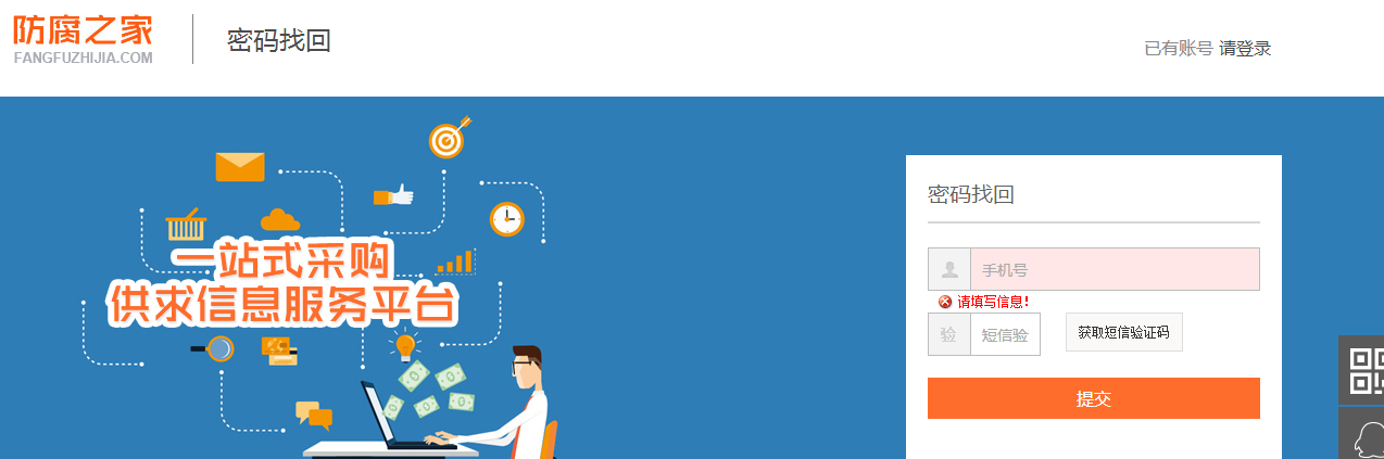 1.在“防腐之家”首頁(yè)右側(cè)部分,點(diǎn)擊【找回密碼】,進(jìn)入密碼找回界面。